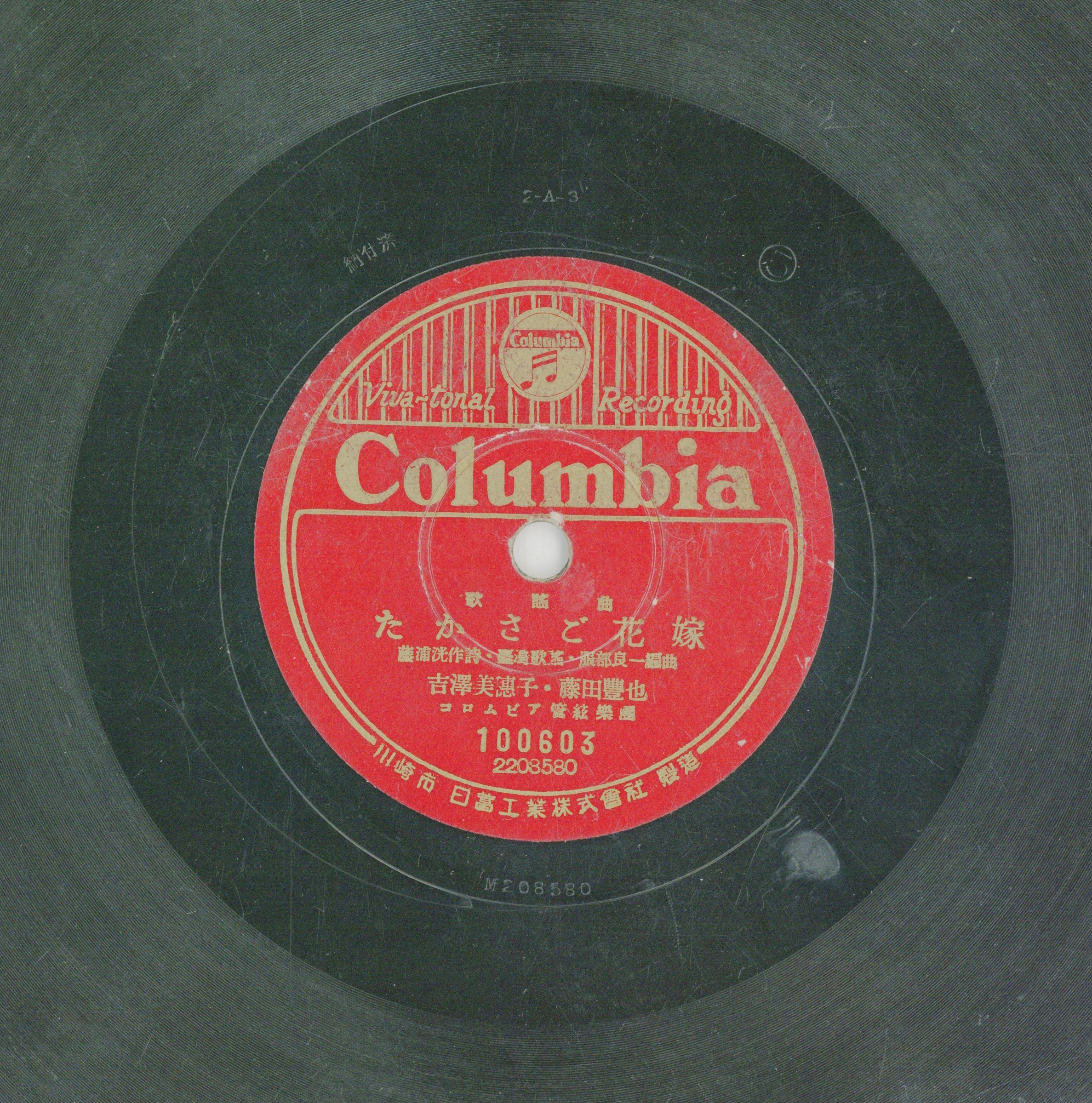 註明有「川崎市日蓄工業株式會社製造」,為日本蓄音器公司在二次大戰期間的產品。「たかさご花嫁」即「高砂新娘」,也就是臺灣新娘。歌曲旋律改編自民謠〈五更鼓〉。自1931年起〈五更鼓〉即有改編為流行歌的作品,受到流行音樂廣泛的應用,這首歌以臺灣新娘為音樂主題,呈現熱鬧的婚禮情節。