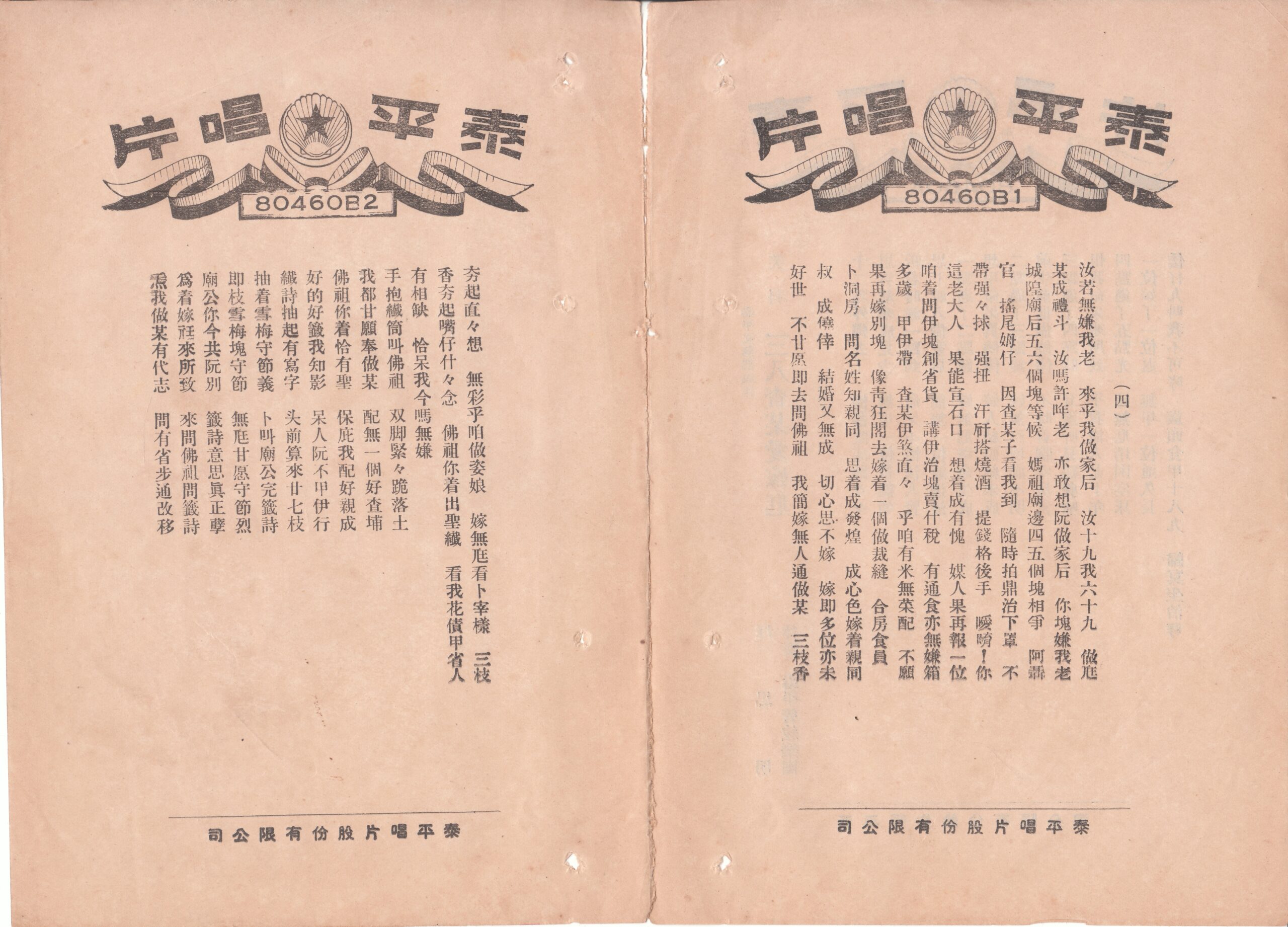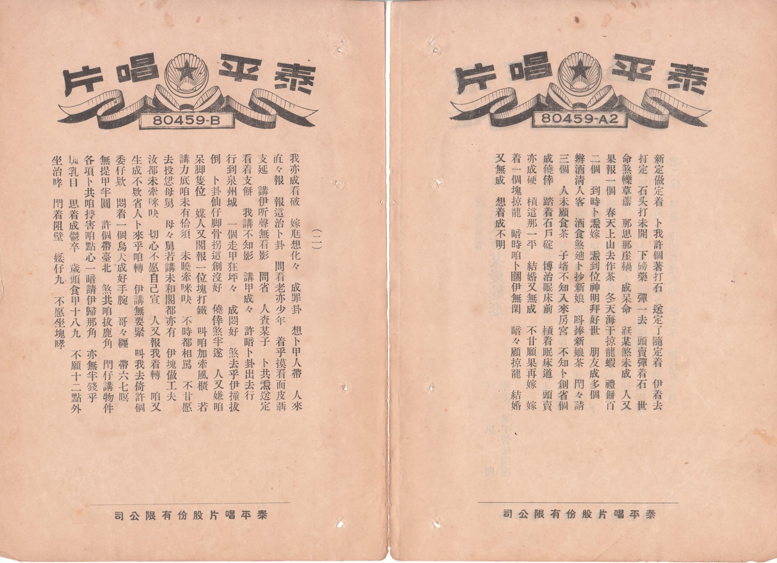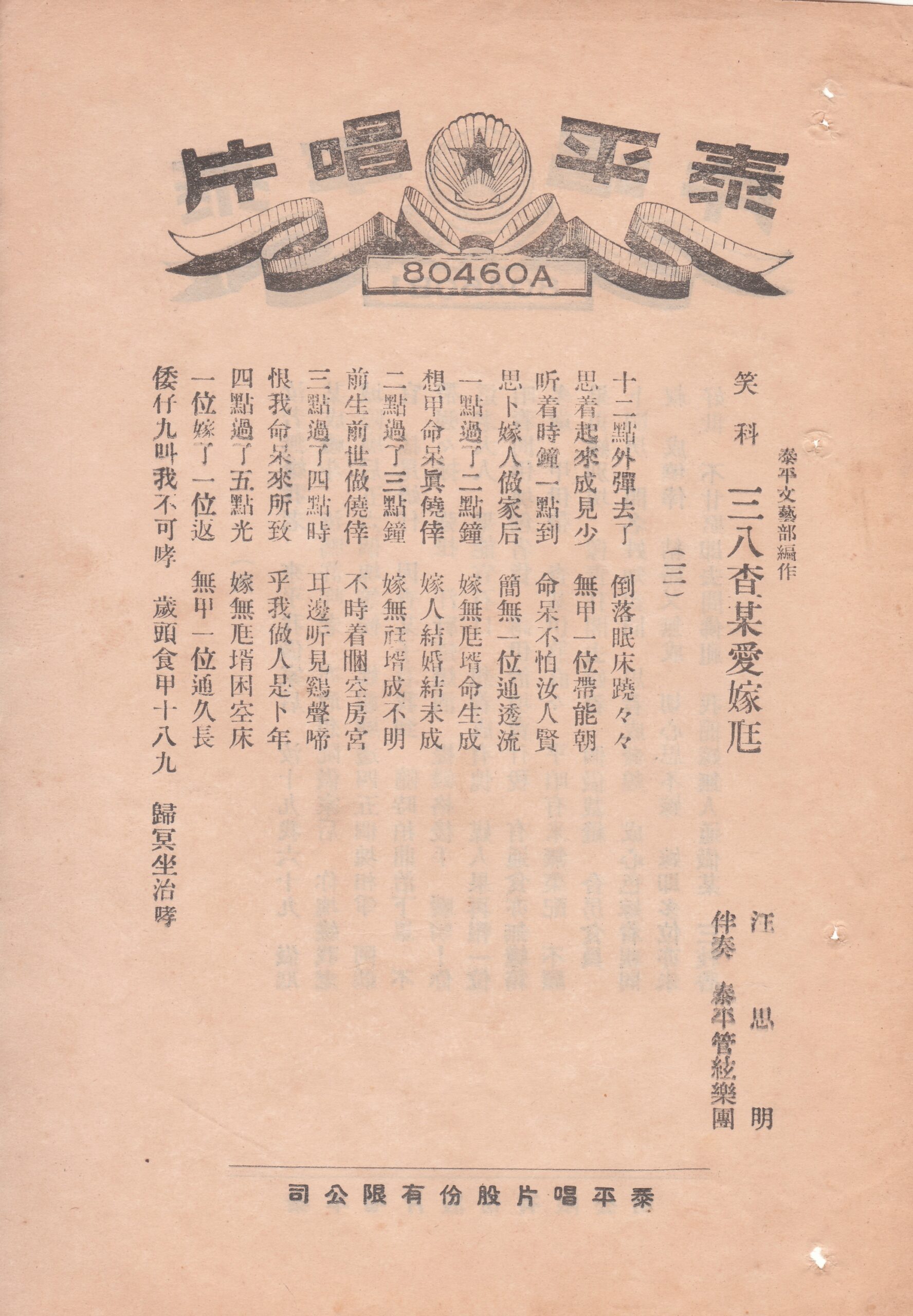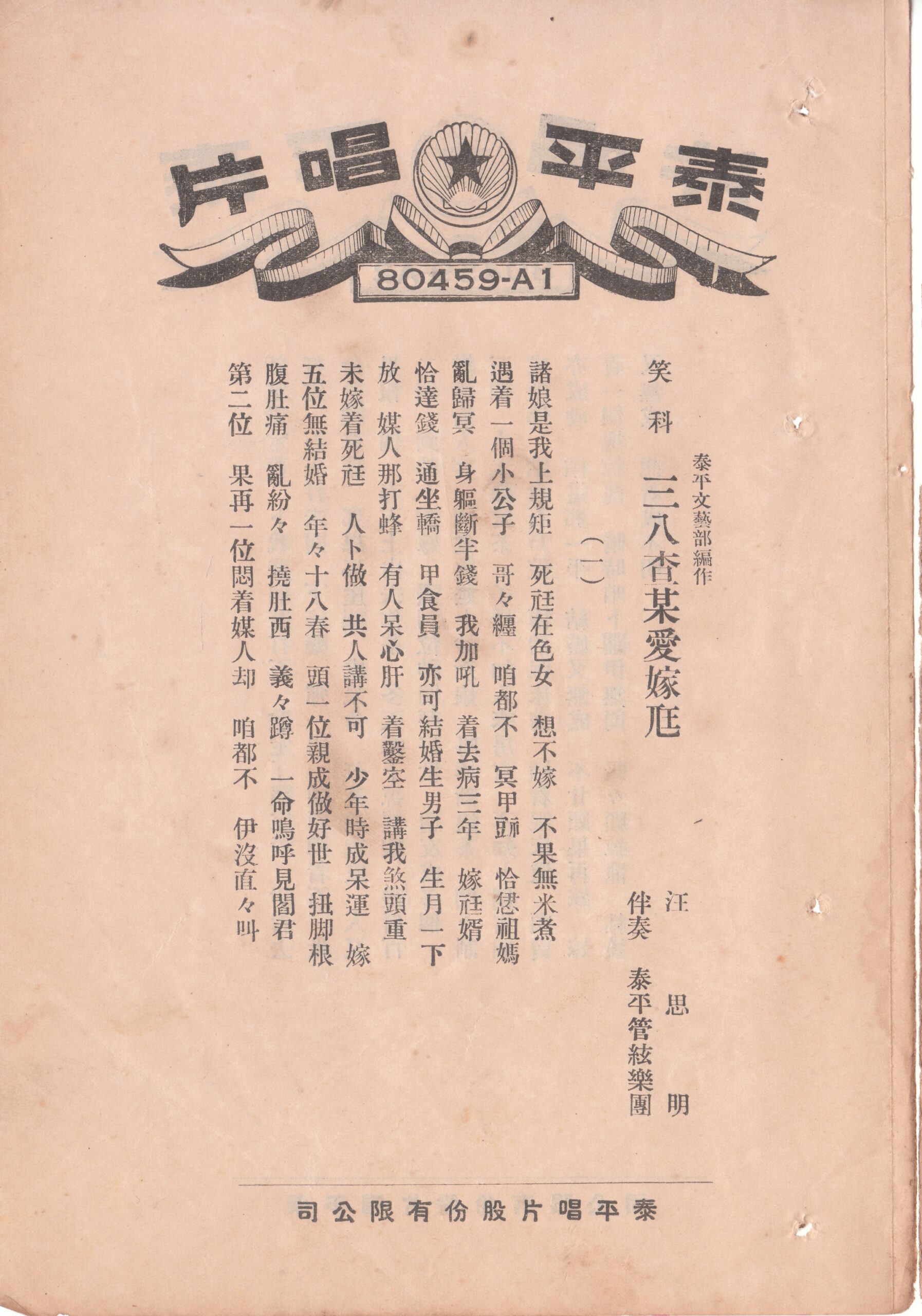 三八查某愛嫁尫 (一) 演出者汪思明演唱創作者泰平文藝部作詞 泰平文藝部作曲關鍵詞#笑科內容唱片內容是一個想結婚的女子在怨嘆沒有理想條件的男子可以結婚(尤其跟職業相關),泰平文藝部編曲,背景音樂有鋼琴伴奏。聲音載體留聲機唱片發行編號泰平80459專輯年份《笑科:三八查某愛嫁尫》1934來源專案成大多元文化中心合作徵集 (2015) 歌詞/全文 唱片內容是一個想結婚的女子在怨嘆沒有理想條件的男子可以結婚(尤其跟職業相關),泰平文藝部編曲,背景音樂有鋼琴伴奏。 相關照片