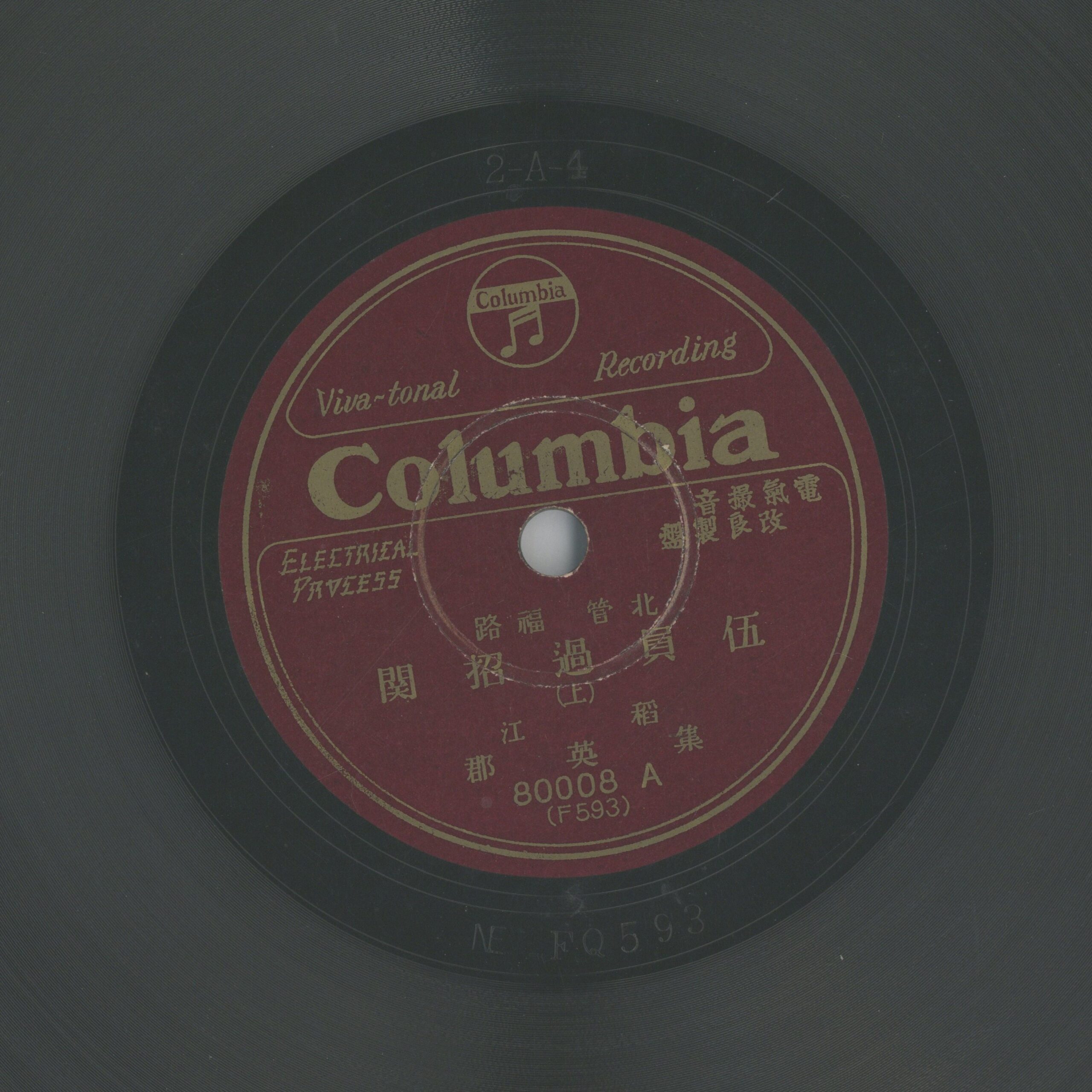 伍員過招關 (上) 演出者稻江 集英郡演唱關鍵詞#南管曲聲音載體留聲機唱片發行編號日蓄 (古倫美亞-臺灣)80008專輯年份《北管 福路:伍員過招關》1930其他曲目B-伍員過招關 (下)來源專案臺史博館藏錄音發布(2026) 相關照片