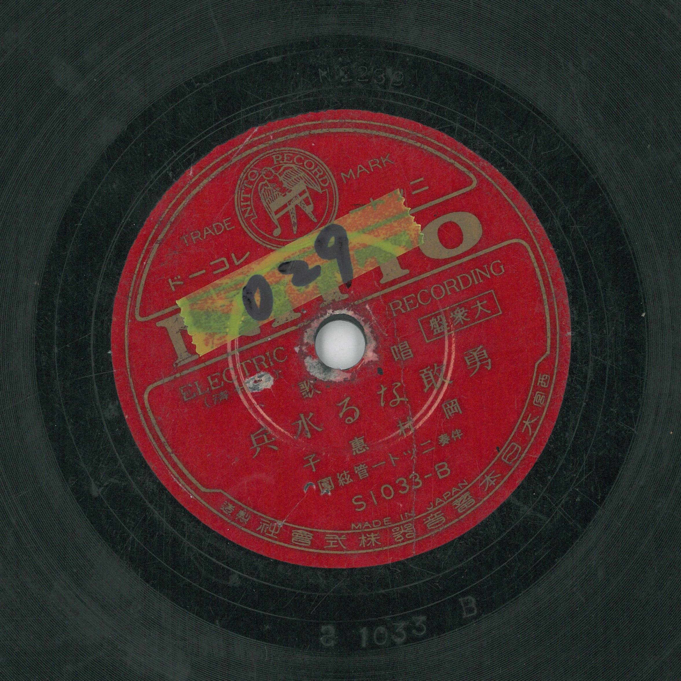 勇敢なる水兵 演出者岡村惠子演唱 ニツトー管絃團伴奏關鍵詞#唱歌 #軍歌 #戰爭聲音載體留聲機唱片發行編號日東S1033專輯年份《唱歌:戰友/勇敢なる水兵》1936專輯資訊大眾盤其他曲目A-戰友來源專案吳三連中心寄存(2015) 相關照片