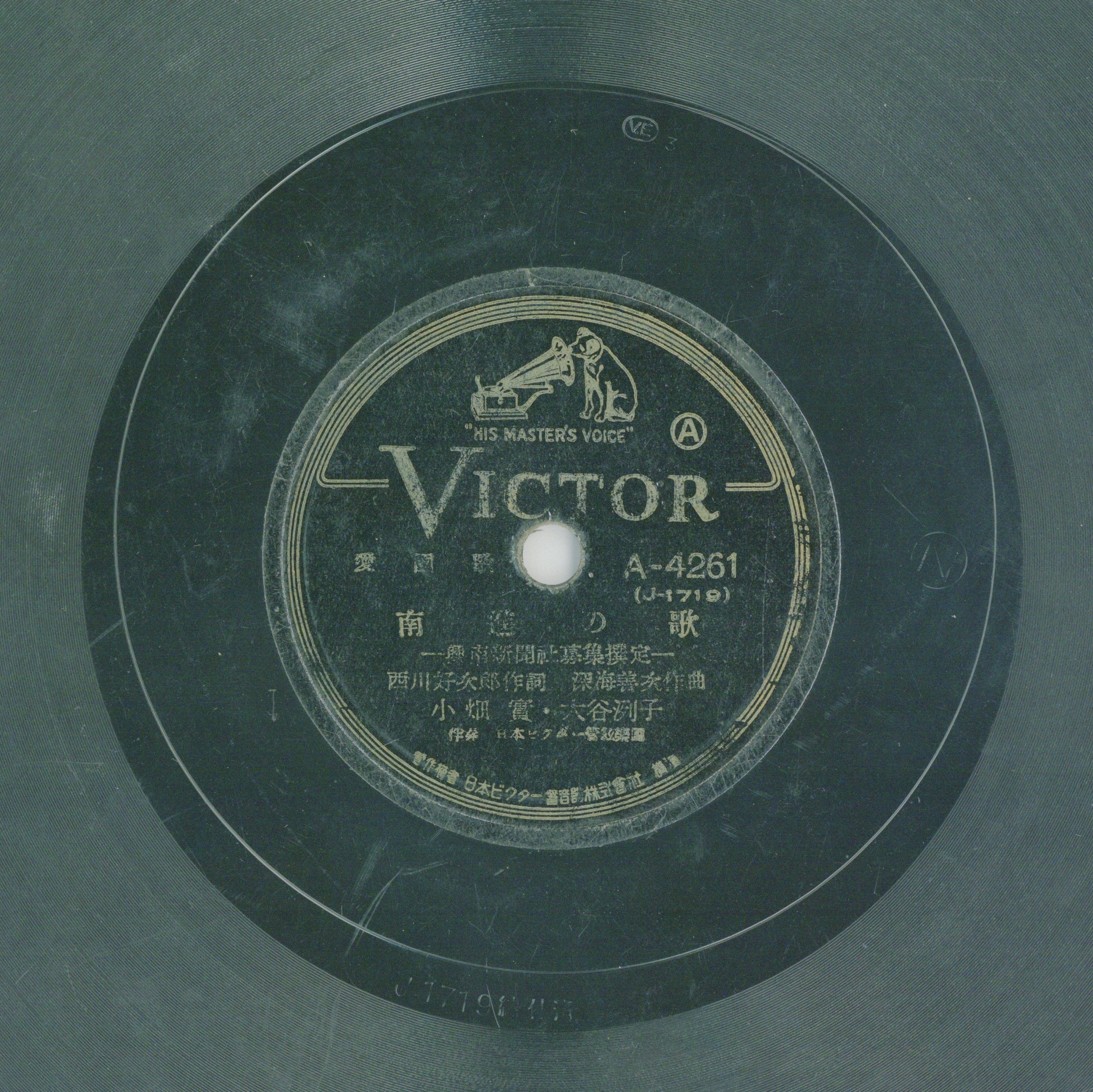 南進の歌 演出者小畑實、大谷洌子演唱 日本ビクター管絃樂團伴奏創作者西川好次郎作詞 深海善次作曲關鍵詞#愛國歌曲 #戰爭時局 #新民謠 #地方歌謠內容註明為「興南新聞社募集撰定」。聲音載體留聲機唱片發行編號ビクター (勝利)A-4261專輯年份《愛國歌:南進の歌/譽の臺灣志願兵》1940其他曲目B-譽の臺灣志願兵來源專案臺史博館藏錄音發布(2026) 相關照片
