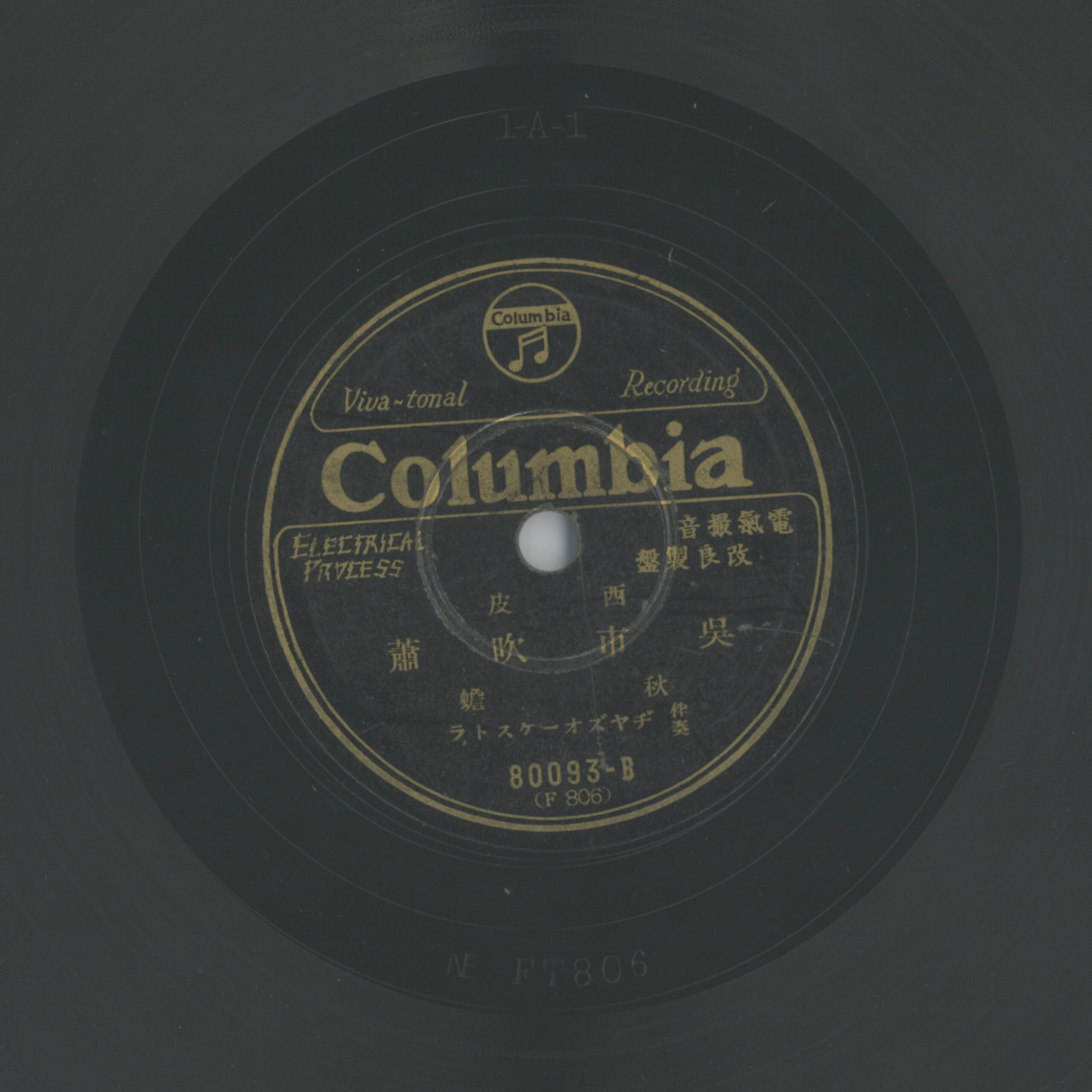 吳市吹簫 演出者秋蟾演唱 ヂヤズオーケストラ(爵士交響樂團)伴奏關鍵詞#小曲 #正音 #京劇 #藝旦內容爵士樂團伴奏的歌謠,藝旦秋蟾以華語演唱的京劇段落。聲音載體留聲機唱片發行編號日蓄 (古倫美亞-臺灣)80093專輯年份《小曲:打花鼓/吳市吹簫》1930其他曲目A-打花鼓來源專案臺史博館藏錄音發布(2026) 相關照片