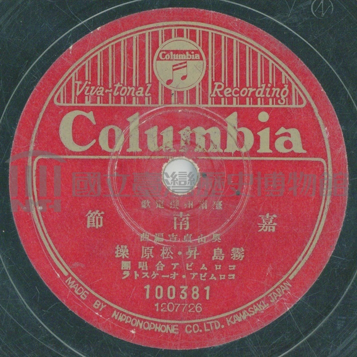 嘉南節 演出者霧島昇、松原操演唱關鍵詞#節慶歌謠 #創作民謠 #地方歌謠內容日本統治時期地方政府募集的日語歌謠,經官方及日本民間機構宣傳。聲音載體留聲機唱片發行編號日本コロムビア (古倫美亞)100381專輯年份《新民謠:嘉南節、豐年節》1941~1942其他曲目曲目-豐年節來源專案臺史博館藏錄音 相關照片