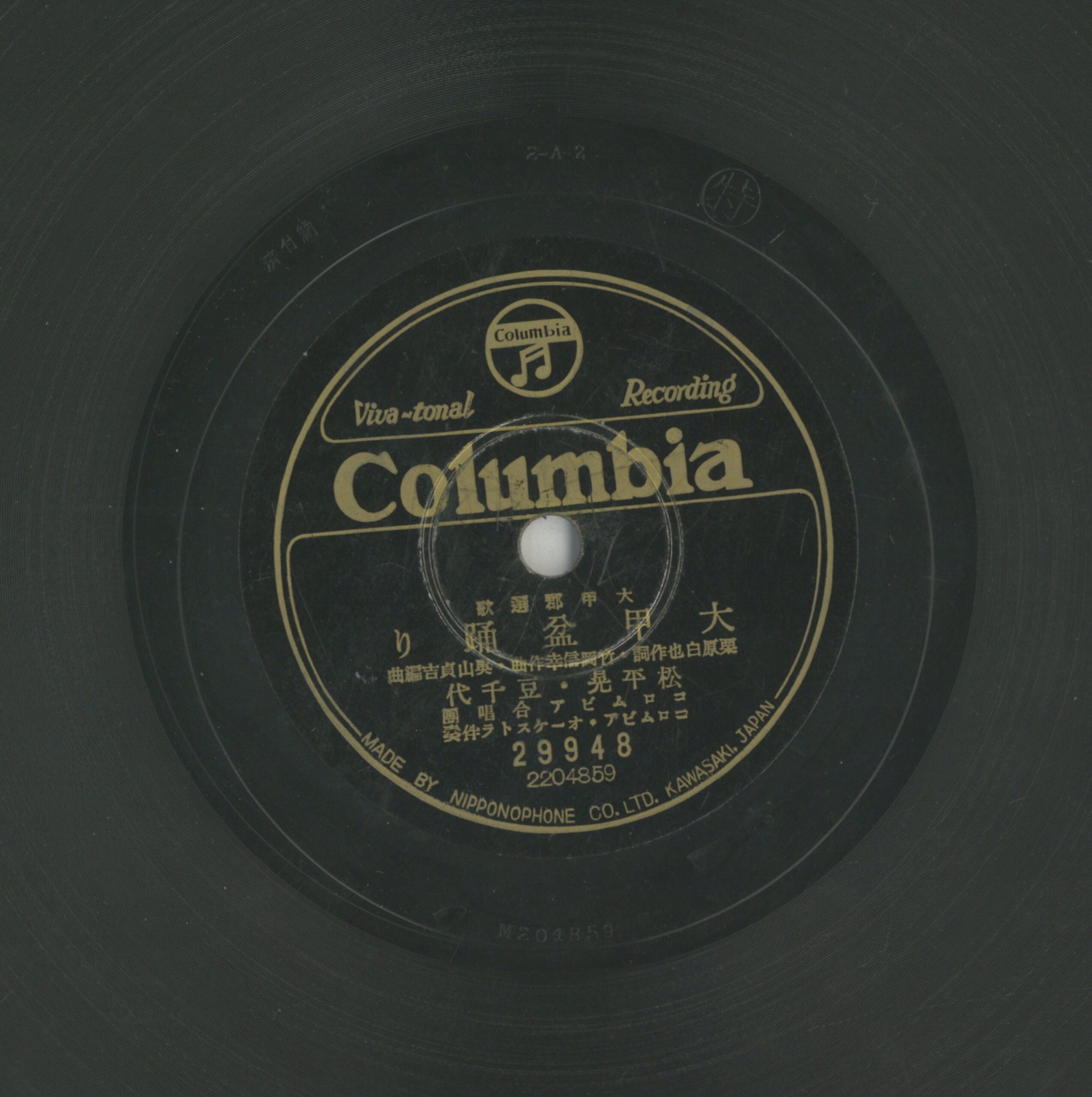 大甲盆踊り 演出者松平晃、豆千代、コロムビア合唱團 合唱演唱 コロムビア‧オーケストラ伴奏創作者栗原白也作詞 竹岡信幸作曲 奧山貞吉編曲關鍵詞#新民謠 #地方民謠內容大甲郡選歌聲音載體留聲機唱片發行編號日蓄 (古倫美亞)29948專輯年份《大甲郡選歌》1938其他曲目A-躍進大甲來源專案臺史博館藏錄音發布(2026) 相關照片