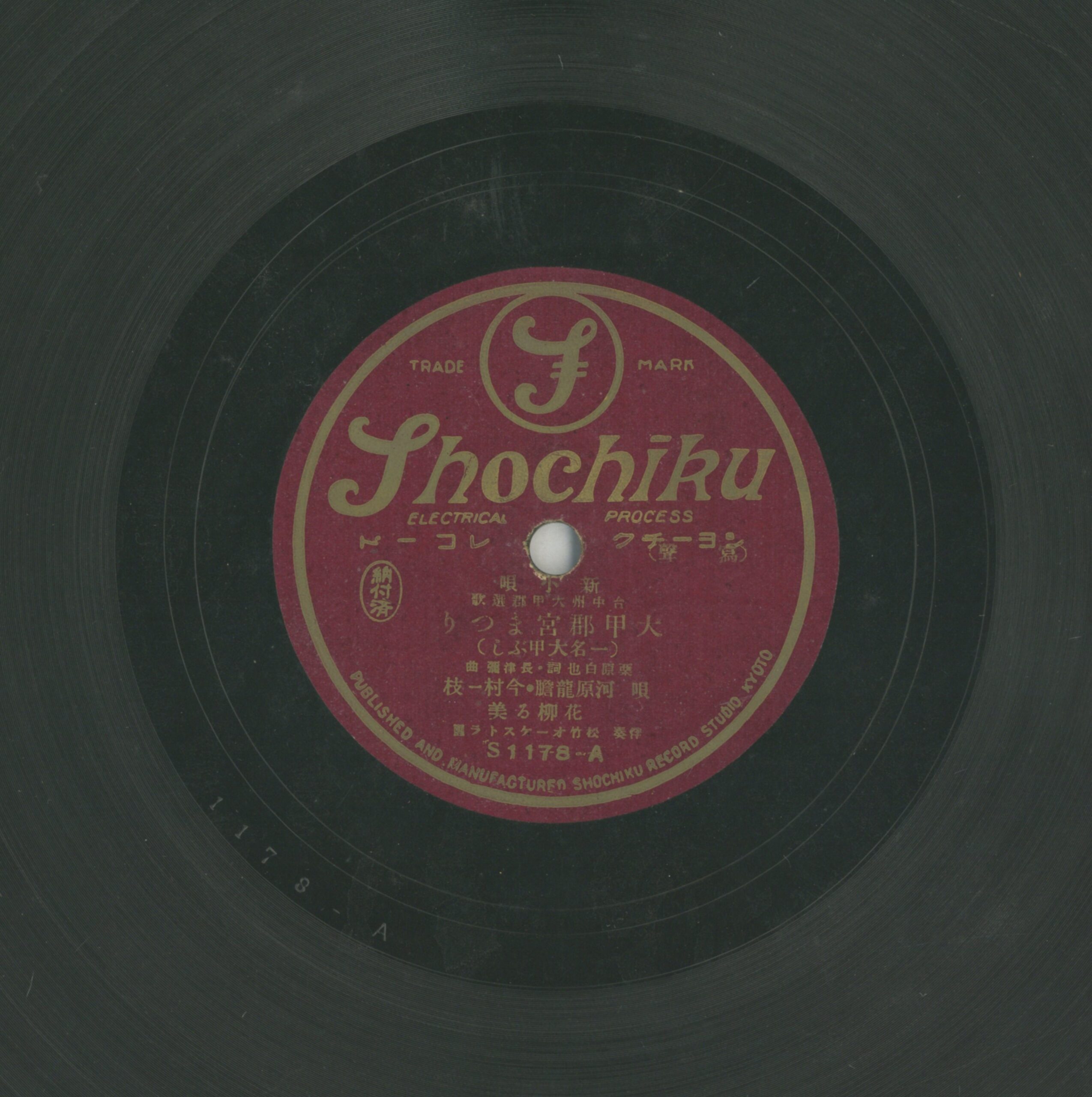 大甲郡宮まつり (一名大甲ぶし) 演出者河原龍膽、金村一枝、花柳ろ美演唱 松竹オーケストラ團伴奏創作者栗原白也作詞 長津彌作曲關鍵詞#新民謠 #地方民謠內容新小唄:台中州大甲郡選歌,歌單寫「新民謠」指新創作的地方特色歌曲。聲音載體留聲機唱片發行編號松竹S1178專輯年份《新小唄:台中州大甲郡選歌》1935~1942來源專案臺史博館藏錄音發布(2026) 相關照片