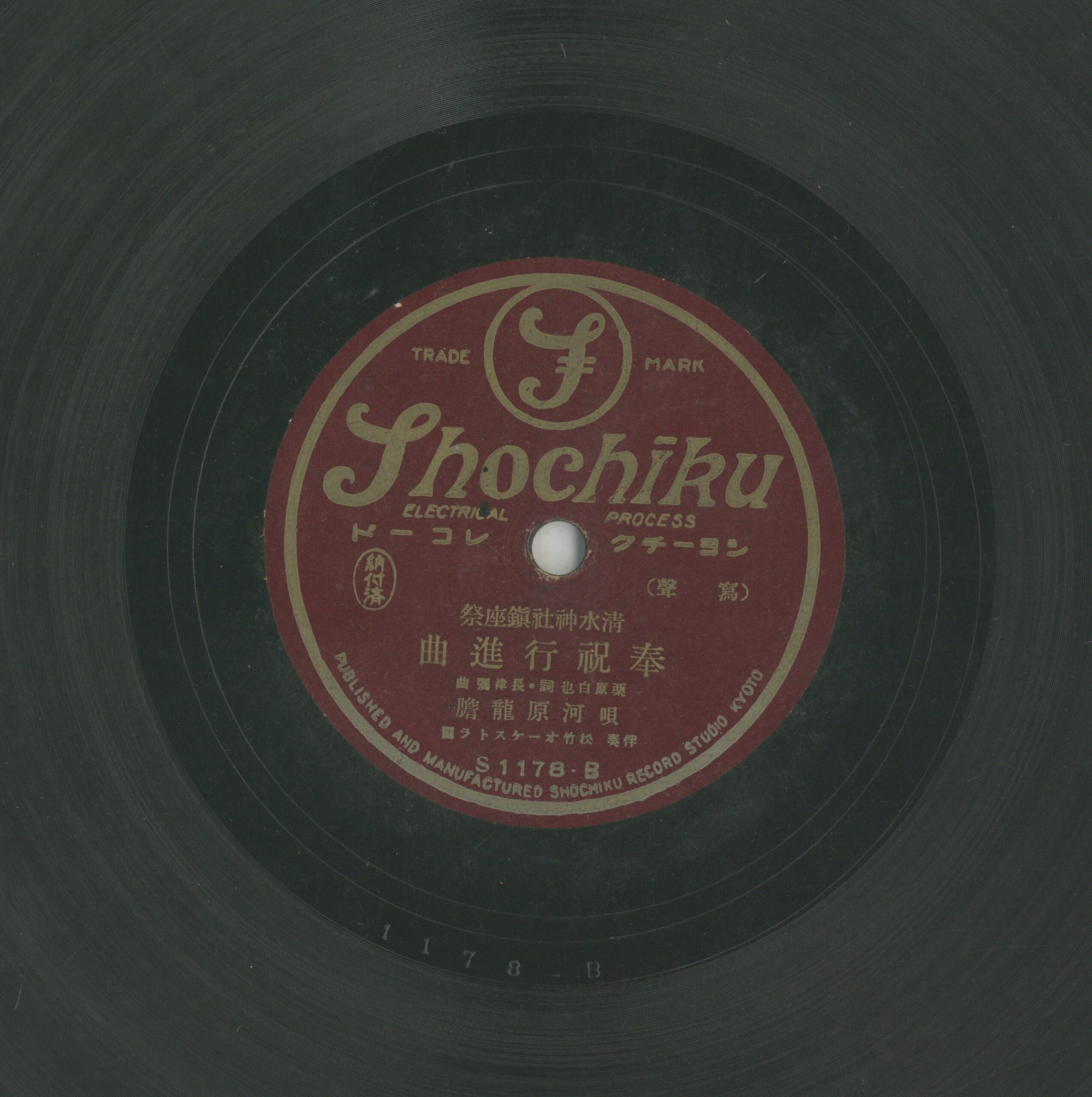 奉祝行進曲 演出者河原龍膽演唱 松竹オーケストラ團伴奏創作者栗原白也作詞 長津彌作曲關鍵詞#新民謠 #地方民謠內容清水神社鎮座祭,歌單寫「新民謠」聲音載體留聲機唱片發行編號松竹S1178專輯年份《清水神社鎮座寄》1935~1942來源專案臺史博館藏錄音發布(2026) 相關照片