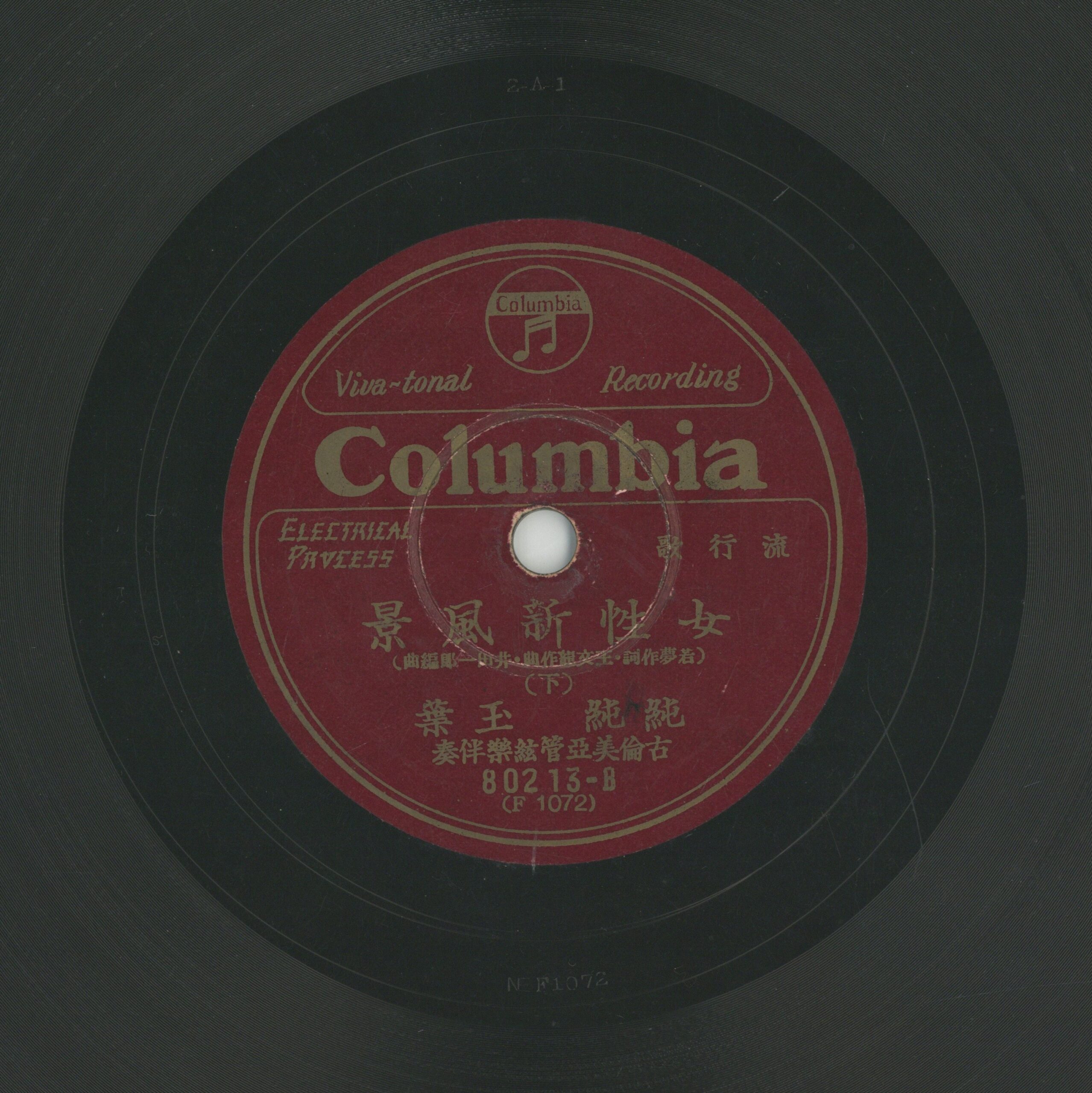 女性新風景 (下) 演出者純純、玉葉演唱 古倫美亞管絃樂伴奏創作者若夢作詞 王文龍作曲 井田一郎編曲關鍵詞#流行歌聲音載體留聲機唱片發行編號日蓄 (古倫美亞-臺灣)80213專輯年份《流行歌:女性新風景》1932~1933其他曲目A-女性新風景 (上)來源專案臺史博館藏錄音發布(2026) 相關照片
