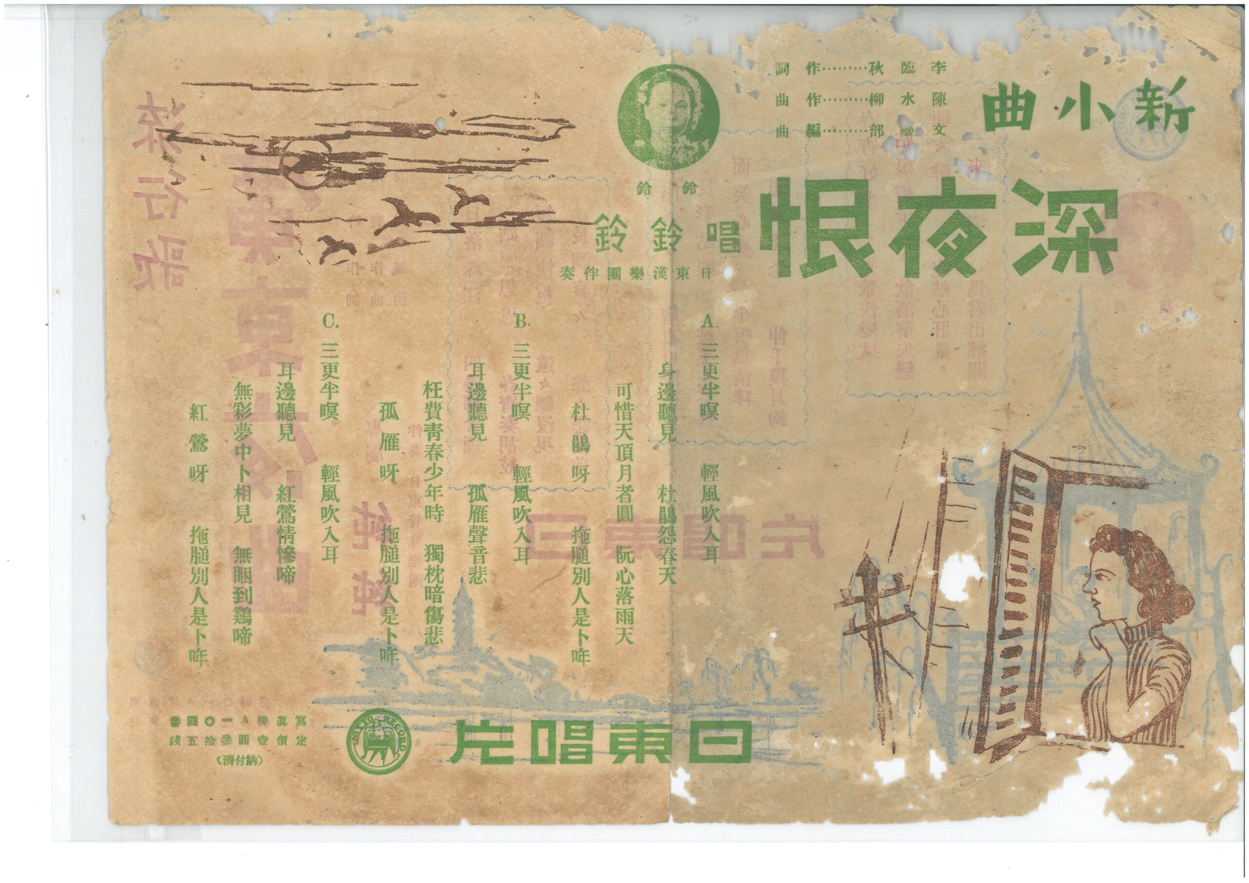 廣東夜曲 演出者純純演唱創作者遊吟作詞、鄧雨賢作曲關鍵詞#唱歌 #流行歌內容樂曲敘述著夕陽下美麗的廣東姑娘在珠江邊彈奏胡絃;深夜裡茶樓的女子雖面帶笑容,心中卻滿是憂愁。不自覺地時間已經由黑夜轉為白天,想藉飲酒來排解憂愁,卻依然無法舒緩思念情人的心情。此曲的作詞者遊吟為陳達儒。聲音載體留聲機唱片發行編號日東A104專輯年份《流行歌:廣東夜曲》1938來源專案愛聽臺灣一百年系列活動(2017) 相關照片