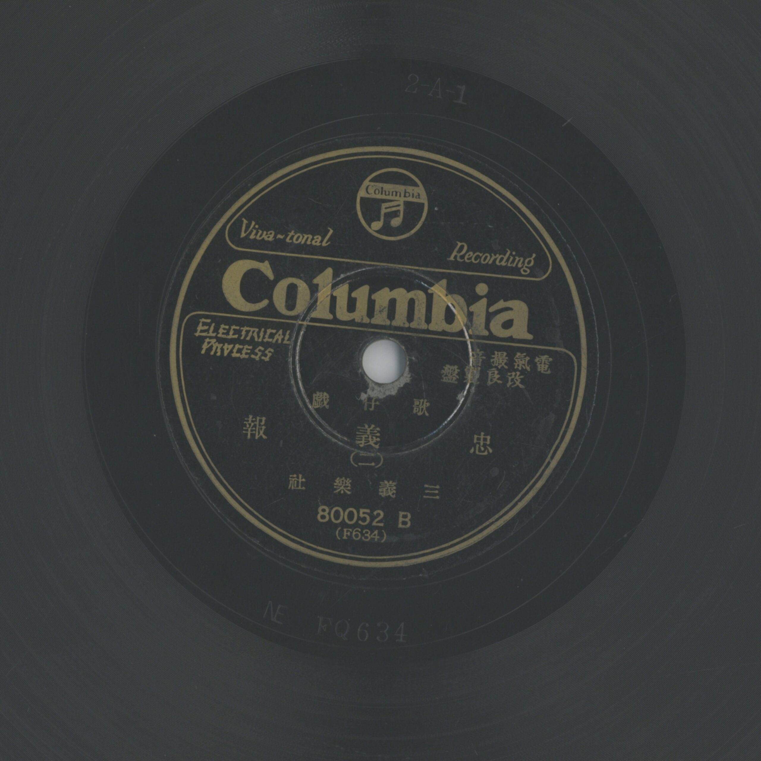 忠義報 (二) 演出者三義樂社演唱關鍵詞#歌仔戲內容全套共2片,此為第一張聲音載體留聲機唱片發行編號日蓄 (古倫美亞-臺灣)80052專輯年份《歌仔戲:忠義報》1930其他曲目1-忠義報 (一) 3-忠義報 (三) 4-忠義報 (四)來源專案臺史博館藏錄音發布(2026) 相關照片