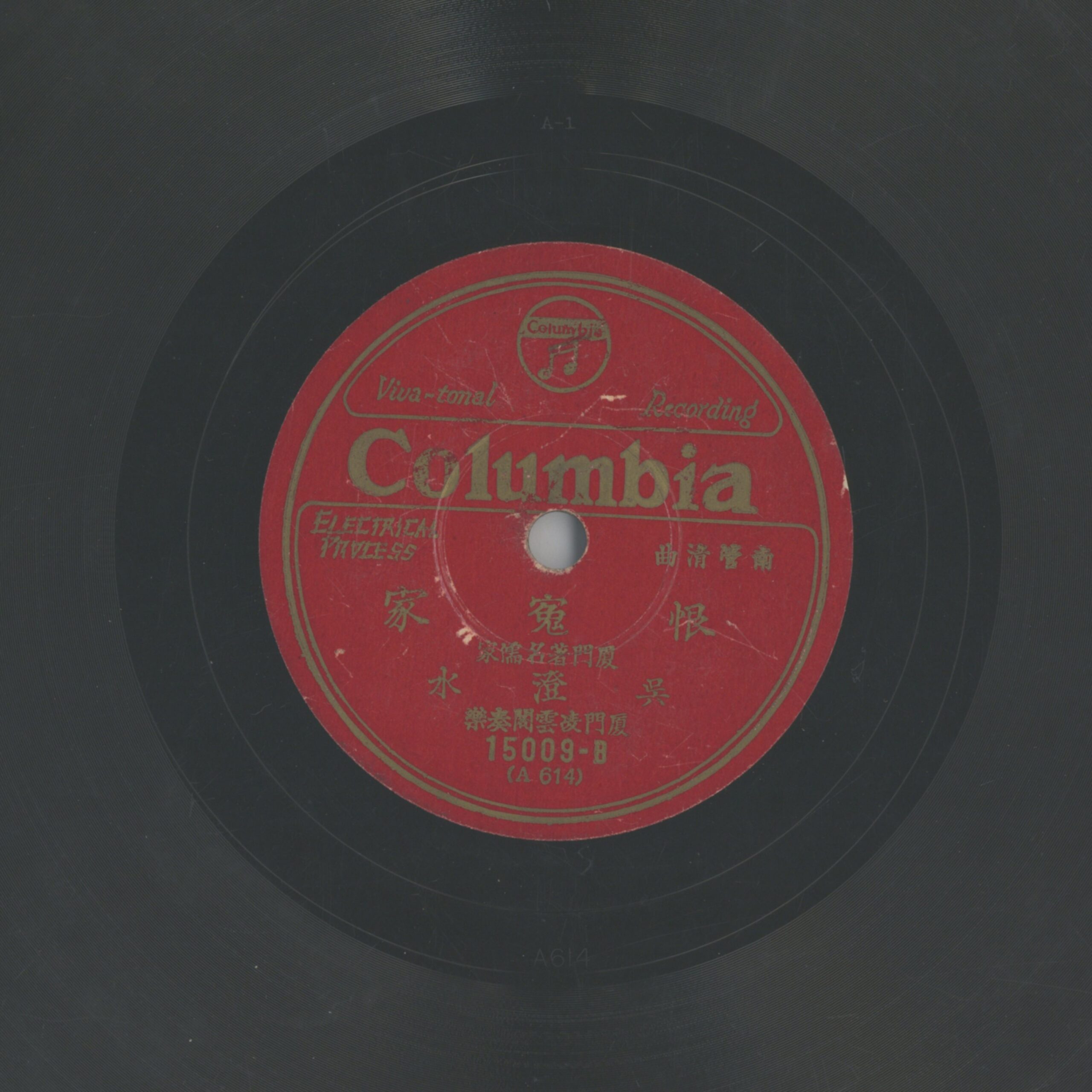 恨冤家 演出者吳澄水、廈門凌雲閣演唱關鍵詞#南管 #清曲內容廈門著名儒家唱,母盤編號A.614。聲音載體留聲機唱片發行編號日蓄 (古倫美亞)15009其他曲目A-聽閑人來源專案臺史博館藏錄音發布(2026) 相關照片