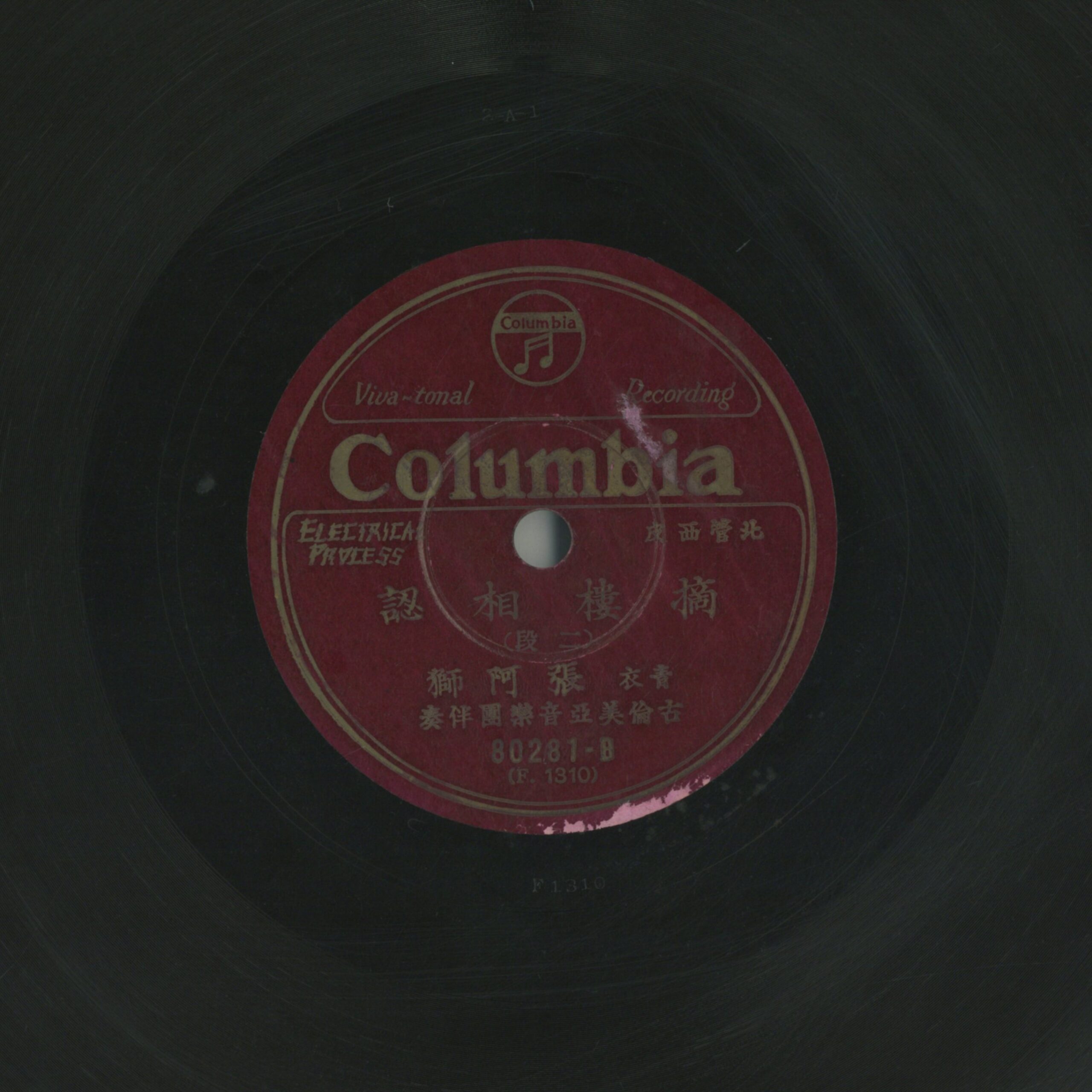 摘樓相認 (二段) 演出者青衣 張阿獅演唱 古倫美亞音樂團伴奏關鍵詞#北管聲音載體留聲機唱片發行編號日蓄 (古倫美亞-臺灣)80281專輯年份《北管西皮:摘樓相認》1933~1934其他曲目1-摘樓相認 (頭段)來源專案臺史博館藏錄音發布(2026) 相關照片