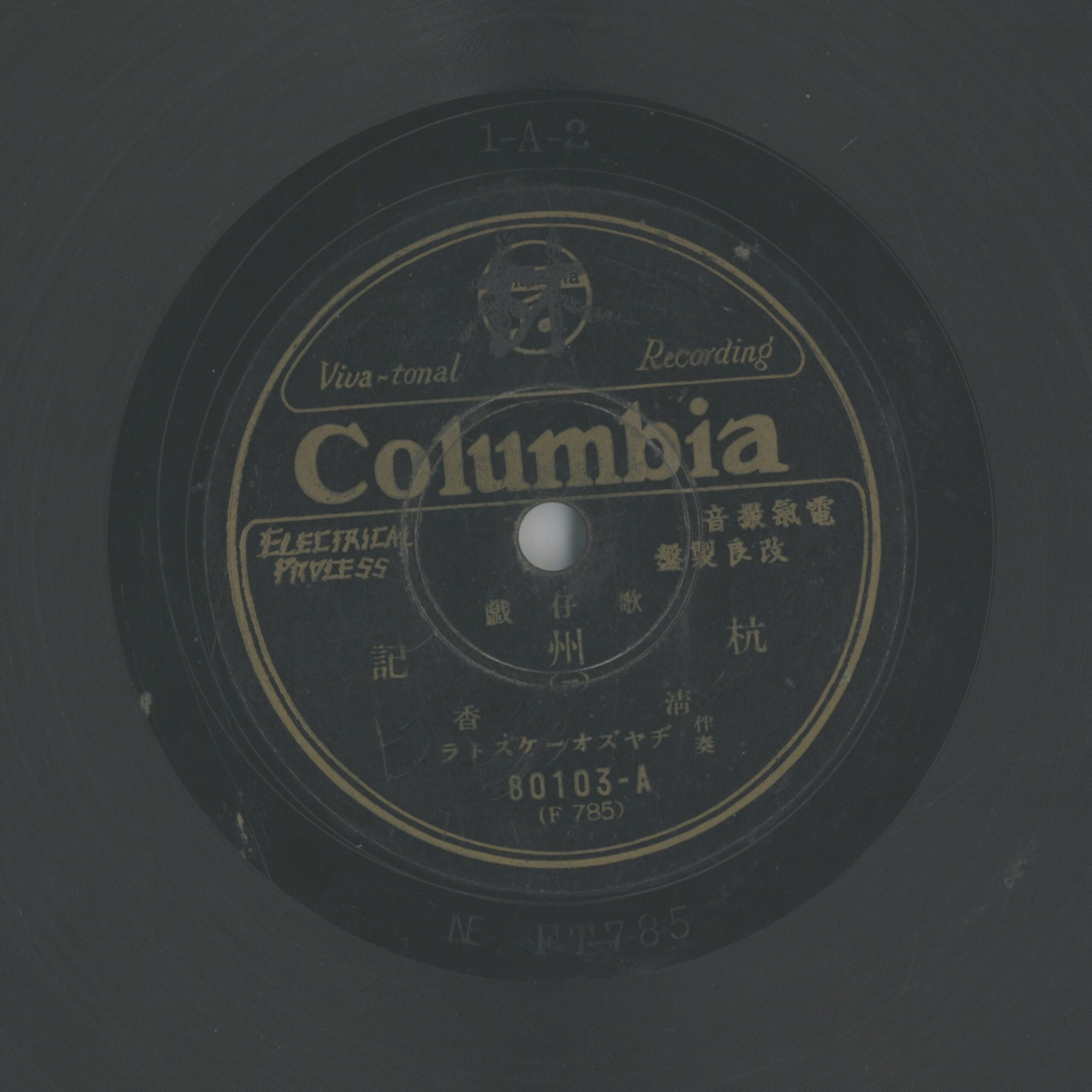 杭州記 (一) 演出者清香演唱 ヂヤズオーケストラ(爵士交響樂團)伴奏關鍵詞#歌仔戲內容爵士樂團伴奏的歌仔戲曲,由歌手清香(劉清香,即歌手純純)演唱。聲音載體留聲機唱片發行編號日蓄 (古倫美亞-臺灣)80103專輯年份《歌仔戲:杭州記》1930~31其他曲目2-杭州記 (二) 3-杭州記 (三) 4-杭州記 (四) 5-杭州記 (五) 6-杭州記 (六)來源專案臺史博館藏錄音發布(2026) 相關照片