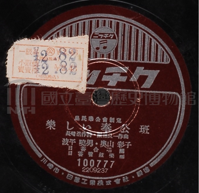 楽しい奉公班 演出者波平暁男、奥山彩子演唱創作者長崎浩作詞、服部良一作曲關鍵詞#愛國歌 #皇民奉公會 #愛國歌曲 #皇民化內容二戰期間防空教育唱片,仁木他喜雄編曲,配合歌單描述動作可以跳舞作為訓練。聲音載體留聲機唱片發行編號日本コロムビア (古倫美亞)100777專輯年份《皇民奉公會制定歌曲:楽しい奉公班、奉公防空群の歌》1943其他曲目曲目-奉公防空群の歌來源專案臺史博館藏錄音 相關照片