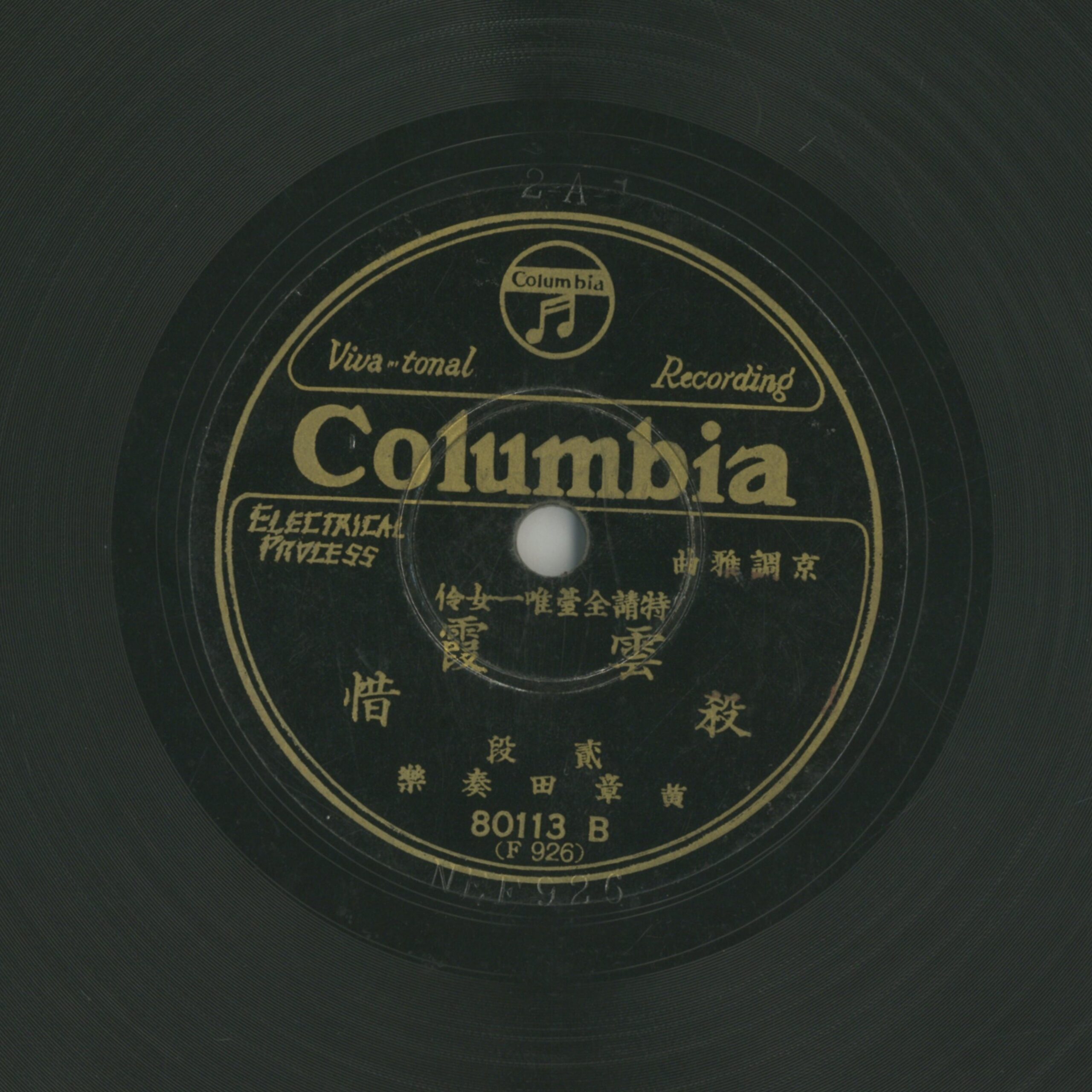 殺惜 (貳段) 演出者雲霞演唱 黃章田伴奏關鍵詞#京劇 #正音內容京調雅曲,特請全臺唯一女伶聲音載體留聲機唱片發行編號日蓄 (古倫美亞-臺灣)80113專輯年份《京調雅曲:殺惜》1930~31其他曲目1-殺惜 (頭段)來源專案臺史博館藏錄音發布(2026) 相關照片