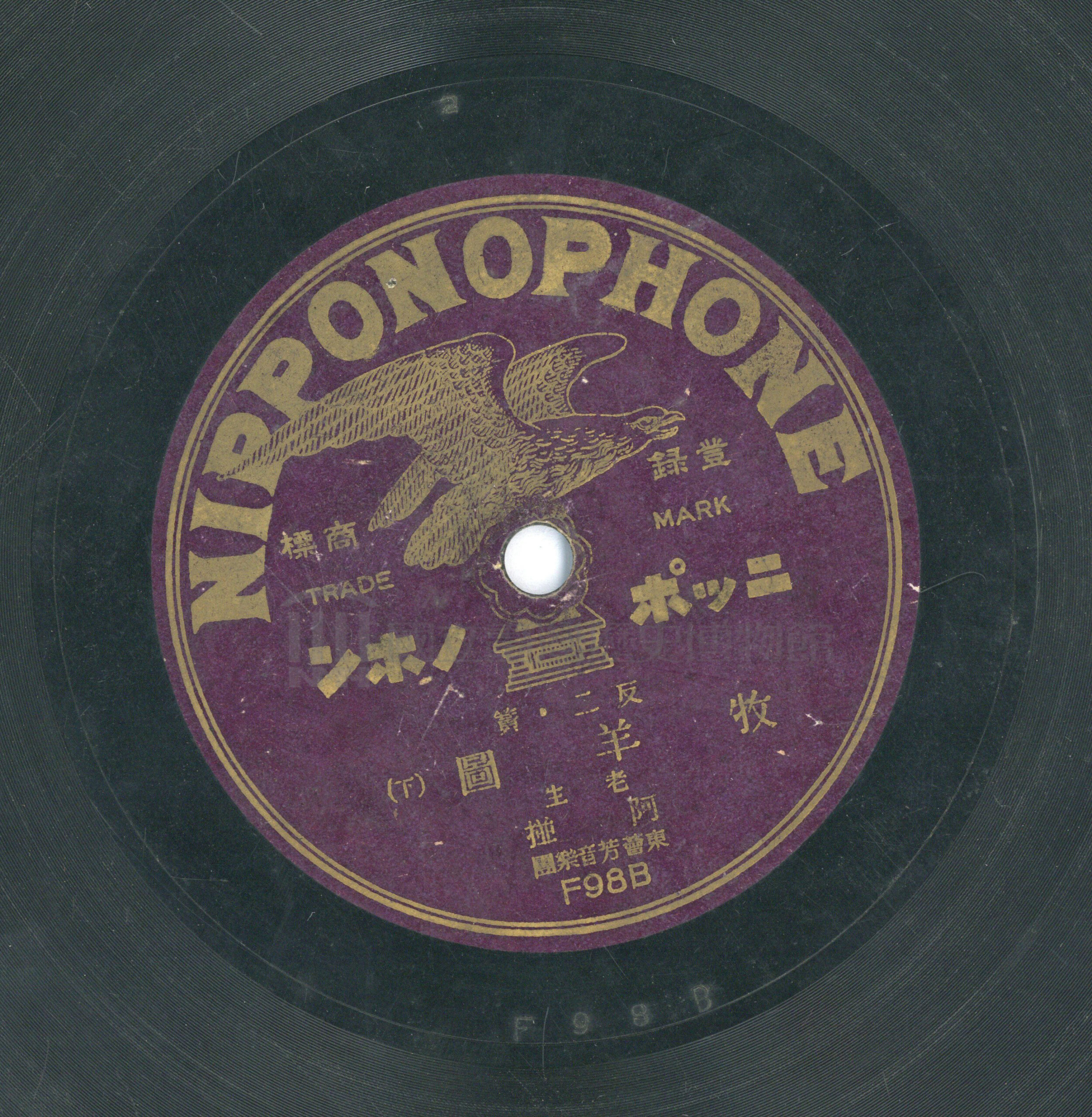 牧羊圖 (下) 演出者阿掽 (老生)演唱關鍵詞#小曲 #京音 #平劇 #藝旦內容依據日日新報報導為1926年5月在臺北灌錄。聲音載體留聲機唱片發行編號日蓄 (鷹標紫色)F98專輯年份《反二.簧:牧羊圖》1926其他曲目曲目-牧羊圖 (上)來源專案臺史博館藏錄音 相關照片