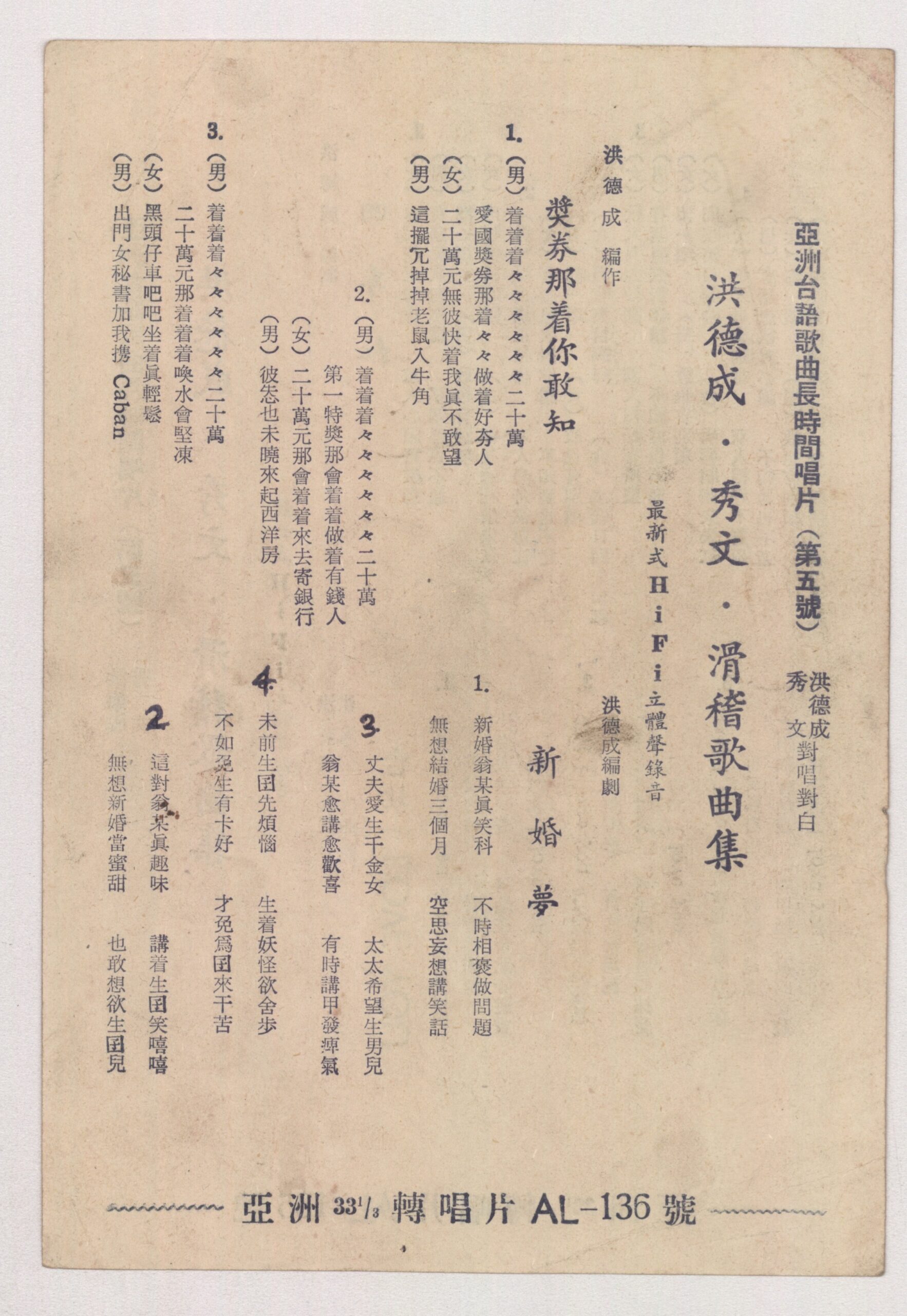 獎券若著你敢知 演出者洪德成、秀文演唱 亞洲唱片管絃樂團伴奏內容1950年代知名廣播員洪德成、秀文夫妻合作演出,夫妻圍繞著愛國獎券展開對話,想像得獎後獎金20萬要如何使用。 (陳明章 蒐藏提供)聲音載體電木唱片 (十吋)發行編號亞洲AL-136專輯年份《洪德成、秀文滑稽歌曲集》1955~57來源專案聽!臺灣在唱歌特展 (2015) 歌詞/全文 1950年代知名廣播員洪德成、秀文夫妻合作演出,夫妻圍繞著愛國獎券展開對話,想像得獎後獎金20萬要如何使用。 (陳明章 蒐藏提供) 相關照片