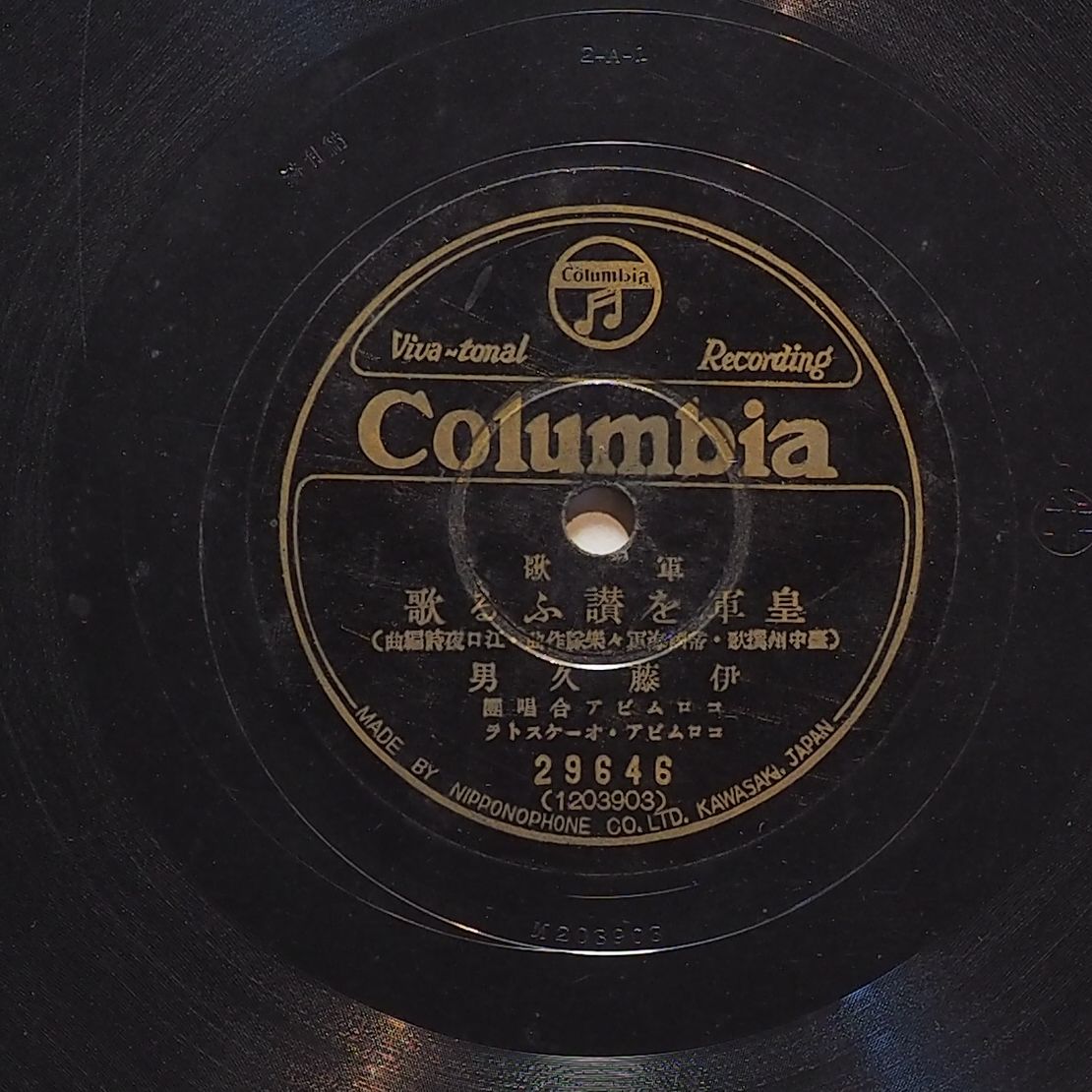 皇軍を讚ふる歌 演出者伊藤久男演唱創作者台中州選歌作詞 海軍軍樂隊作曲 江口夜詩編曲關鍵詞#日語流行歌 #軍歌 #時局歌曲內容〈皇軍を讃うる歌〉,伊藤久男、合唱団演唱,台中州選歌作詞、海軍軍楽隊作曲。 為臺中州廳舉辦的歌詞徵選,製作成時局歌曲,1938年3月發行。聲音載體留聲機唱片發行編號日蓄 (古倫美亞)29646專輯年份《軍歌:皇軍を讚ふる歌、島の總動員》1938其他曲目曲目-島の總動員來源專案臺史博館藏錄音發布(2026) 相關照片