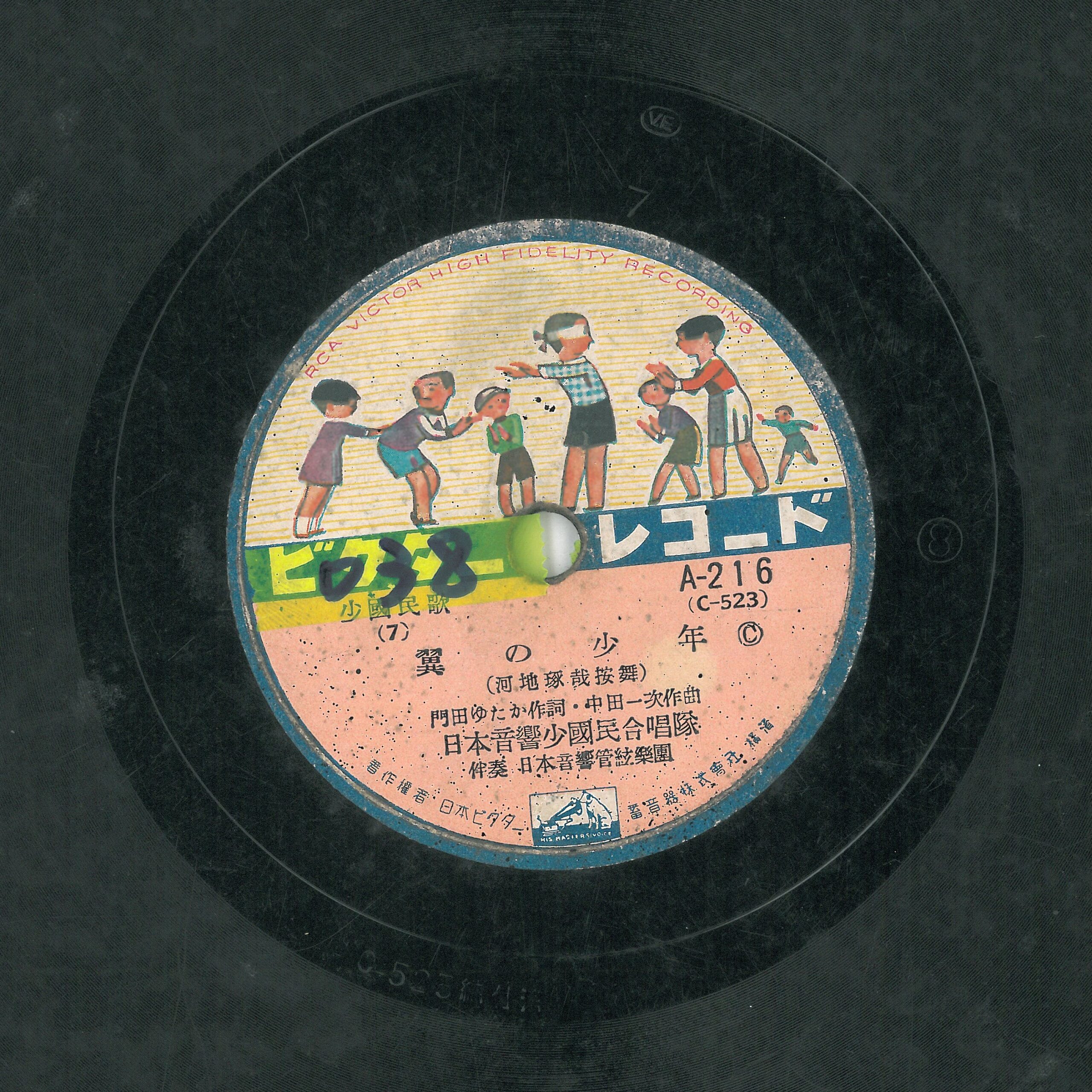 翼の少年 演出者日本音響少國民合唱隊演唱 日本音響管絃樂團伴奏創作者門田ゆたか作詞 中田一次作曲關鍵詞#童謠內容錄音編號為C-523;按舞,河地琢哉;日本放送會撰定聲音載體留聲機唱片發行編號ビクター (勝利)A-216其他曲目B-空の少年兵來源專案吳三連中心寄存(2015) 相關照片