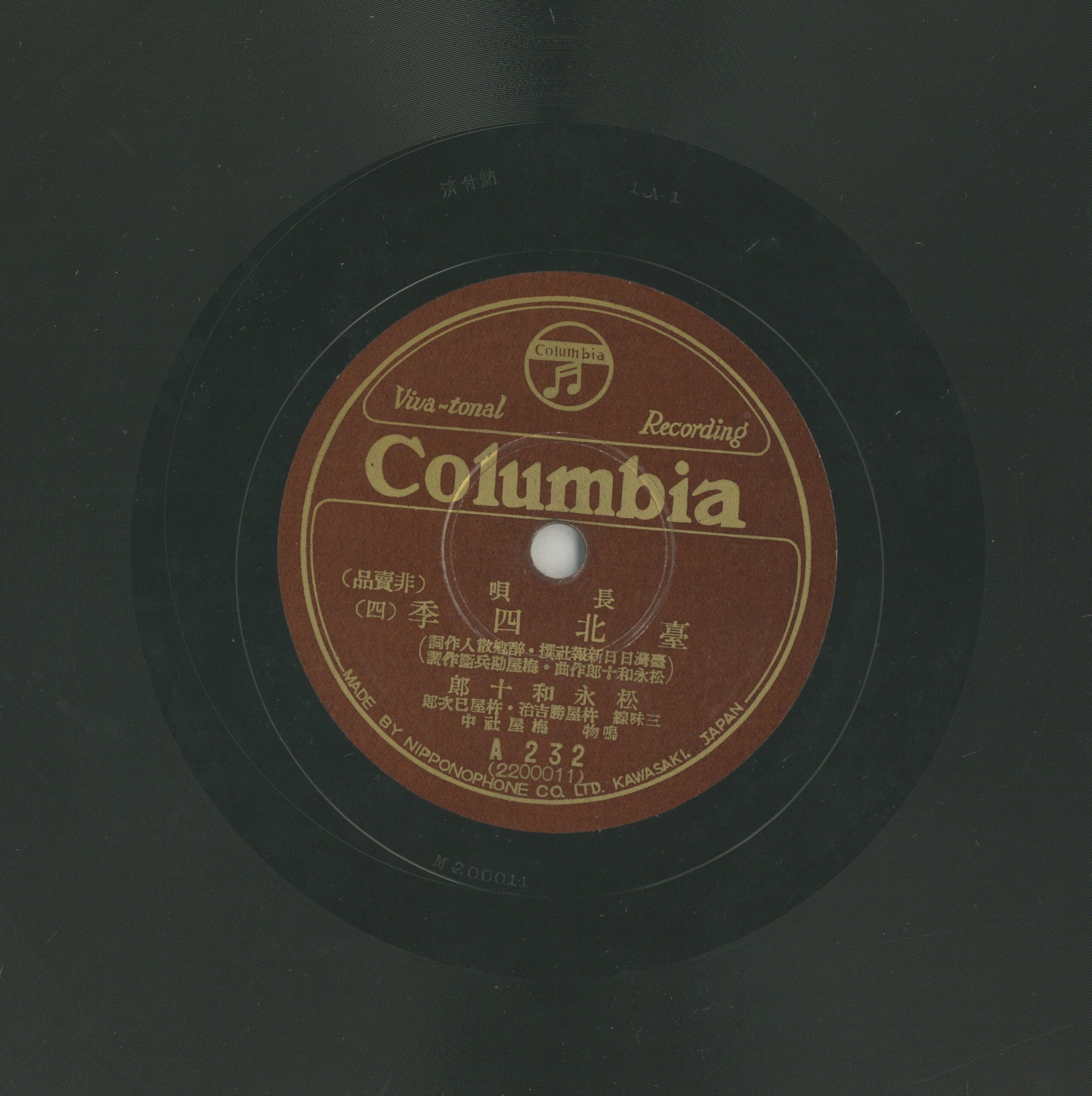 臺北四季 (四) 演出者松永和十郎演唱 杵屋勝吉治、杵屋己次郎、梅屋社中伴奏創作者醉鄉散人作詞 松永和十郎作曲 梅屋勘兵衛編曲關鍵詞#長唄內容圓標上有印製「非賣品」,撰:臺灣日日新報社;作調:梅屋勘兵衛;三味線:杵屋勝吉治、杵屋己次郎;鳴物:梅屋社中。 「長唄 (Nagauta)」是源自歌舞伎、以三味線(細棹)伴奏的傳統歌曲形式,由「唄方」和「三味線方」合演。聲音載體留聲機唱片發行編號日蓄 (古倫美亞)A232其他曲目1-臺北四季 (一) 2-臺北四季 (二) 3-臺北四季 (三)來源專案臺史博館藏錄音發布(2026) 相關照片