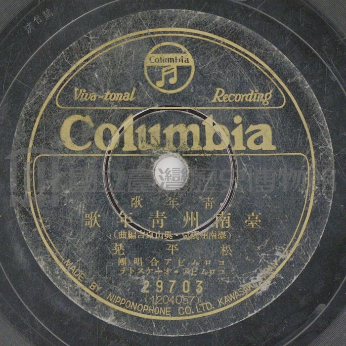臺南州青年歌 演出者松平晃演唱創作者臺南州撰定作詞、臺南州撰定作曲關鍵詞#州歌內容奧山貞吉編曲,伴唱者:古倫美亞合唱團聲音載體留聲機唱片發行編號日本コロムビア (古倫美亞)29703專輯年份《臺南州制定青年歌曲》1938年05月其他曲目曲目-命がけ來源專案臺史博館藏錄音 相關照片