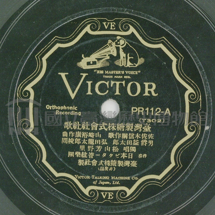 臺灣製糖株式會社社歌 演出者松山芳野里演唱創作者佐佐木信綱作詞、山崎裕康作曲關鍵詞#臺糖 #瑞竹 #裕仁皇太子 #行啟紀念日內容校閱;男爵益田太郎、弘田龍太郎 伴奏:日本ビクター管絃樂團 唱片圓標註明「臺灣製糖株式會社謹製(非賣品)」聲音載體留聲機唱片發行編號日本ビクター (勝利日本本社)PR112其他曲目曲目-瑞竹之歌、曲目-臺灣製糖株式會社社歌(鋼琴伴奏)、曲目-行啟紀念日祝歌來源專案臺史博館藏錄音 相關照片