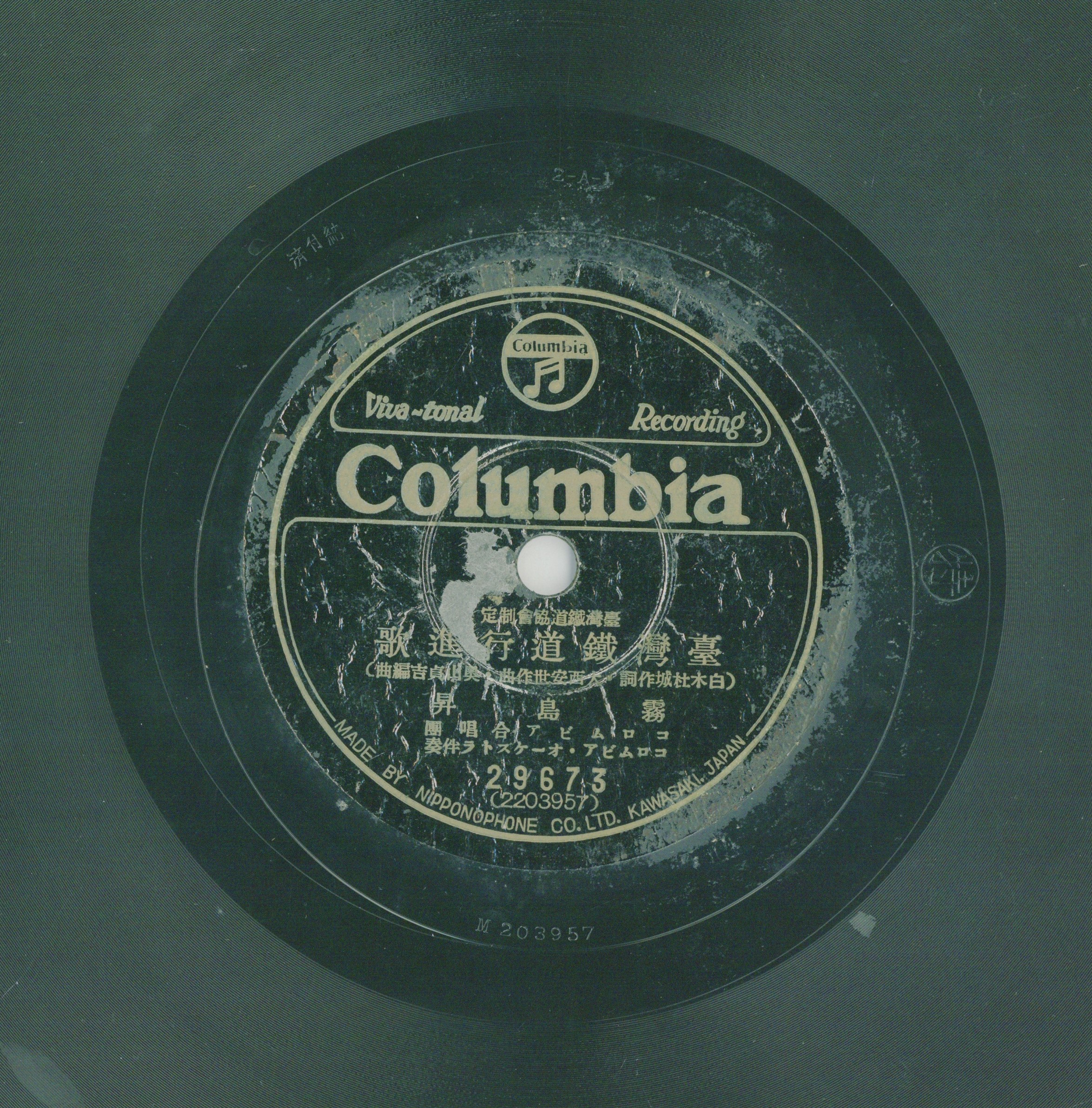 臺灣鐵道行進歌 演出者霧島昇、コロムビア合唱團演唱 コロムピア.オーケストラ伴奏創作者白木社城作詞 大西安世作曲 奧山貞吉編曲關鍵詞#組織歌曲 #新民謠 #地方歌謠聲音載體留聲機唱片發行編號日蓄 (古倫美亞)26973專輯年份《臺灣教育會制定:臺灣少年行進歌/臺灣青年の歌》1938來源專案臺史博館藏錄音發布(2026) 相關照片