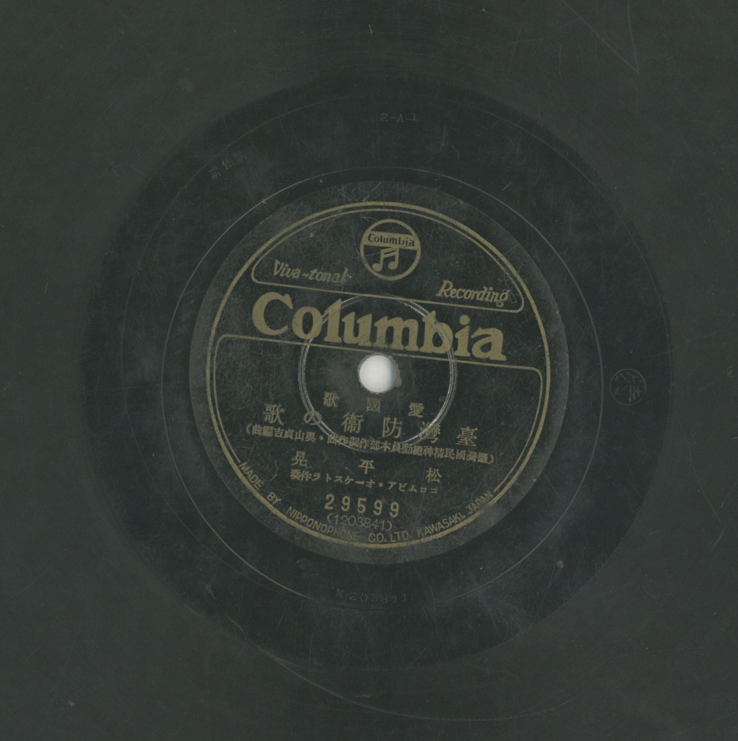 臺灣防衛の歌 演出者松平晃演唱 コロムビア‧オーケストラ伴奏創作者臺灣國民精神總動員本部作詞 臺灣國民精神總動員本部作曲 奧山貞吉編曲關鍵詞#流行歌 #愛國歌曲 #戰爭時局聲音載體留聲機唱片發行編號日蓄 (古倫美亞)29599專輯年份《愛國歌:慰問袋に添へて/臺灣防衛の歌》1938其他曲目A-慰問袋に添へて來源專案臺史博館藏錄音發布(2026) 相關照片