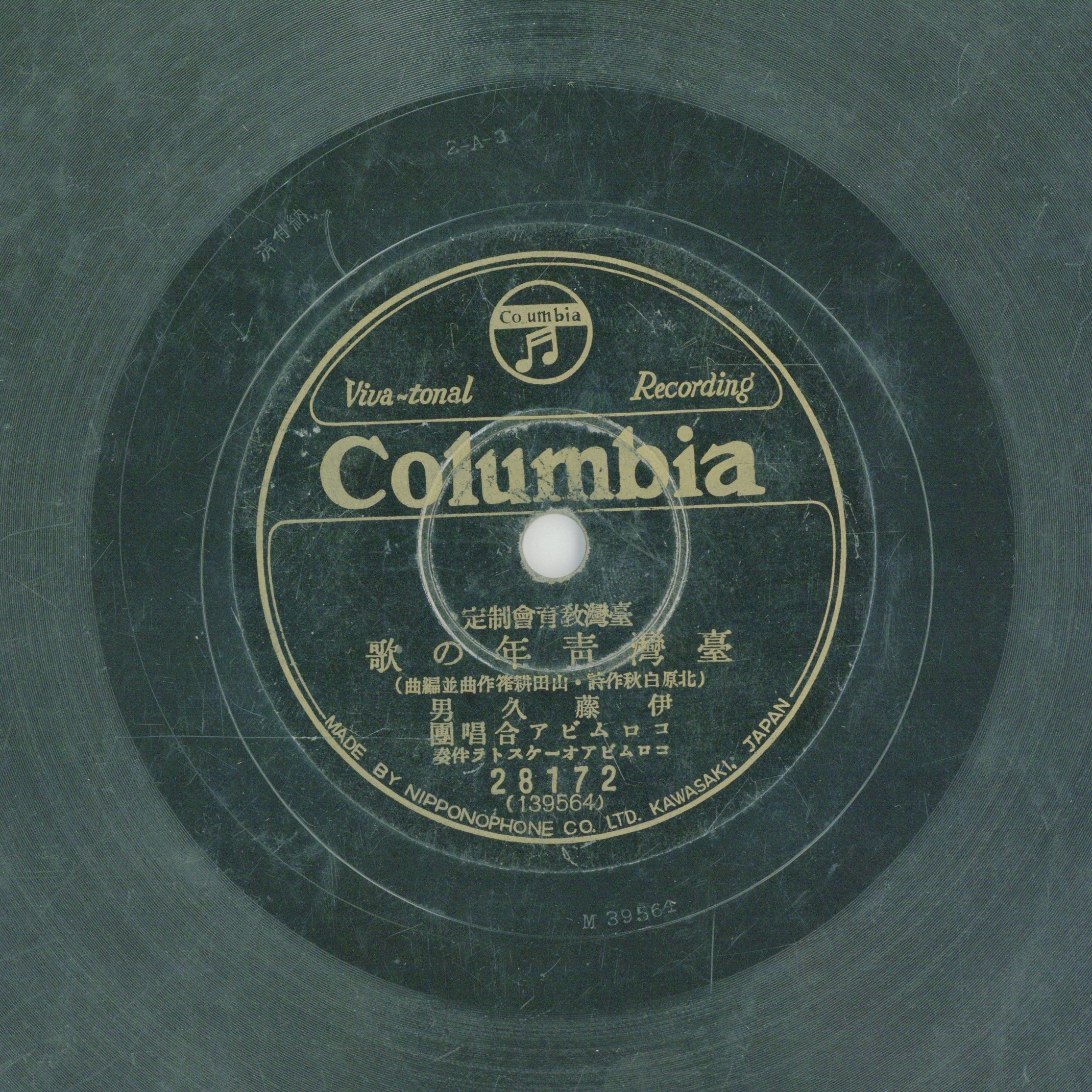 臺灣青年の歌 演出者伊藤久男、コロムビア合唱團 合唱演唱 コロムピア.オーケストラ伴奏創作者北原白秋作詞 山田耕筰作曲 山田耕筰編曲關鍵詞#組織歌曲 #新民謠 #地方歌謠聲音載體留聲機唱片發行編號日蓄 (古倫美亞)28172專輯年份《臺灣教育會制定:臺灣少年進行曲/臺灣青年の歌》1935來源專案臺史博館藏錄音發布(2026) 相關照片