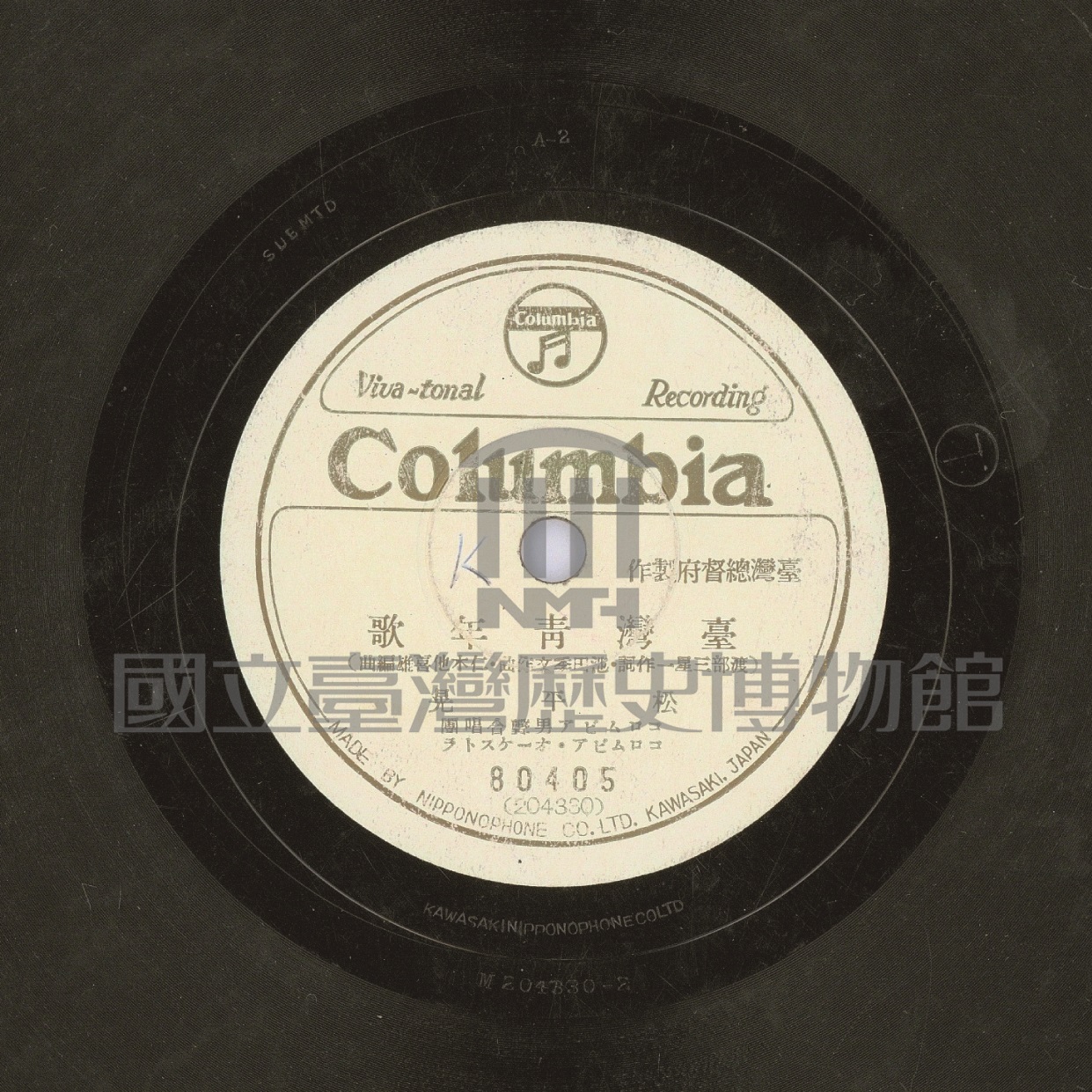 臺灣青年歌 演出者松平晃演唱創作者渡邊三星一作詞 池田季文作曲 仁木他喜雄編曲關鍵詞#唱歌 #皇民化內容仁木他喜雄編曲,古倫美亞管弦樂團演奏。聲音載體留聲機唱片發行編號日蓄 (古倫美亞)80405專輯年份《講演/歌曲:向青年演說》1938年05月專輯資訊為1938年臺灣總督府製作、臺灣古倫比亞販賣株式會社出版,臺灣總督小林躋造錄製留聲機唱片,呼籲青年在戰時體制下的精神動員。其他曲目A-講演:青年に告ぐ來源專案日本民博音響資料係授權(2019) 歌詞/全文 仁木他喜雄編曲,古倫美亞管弦樂團演奏。 相關照片