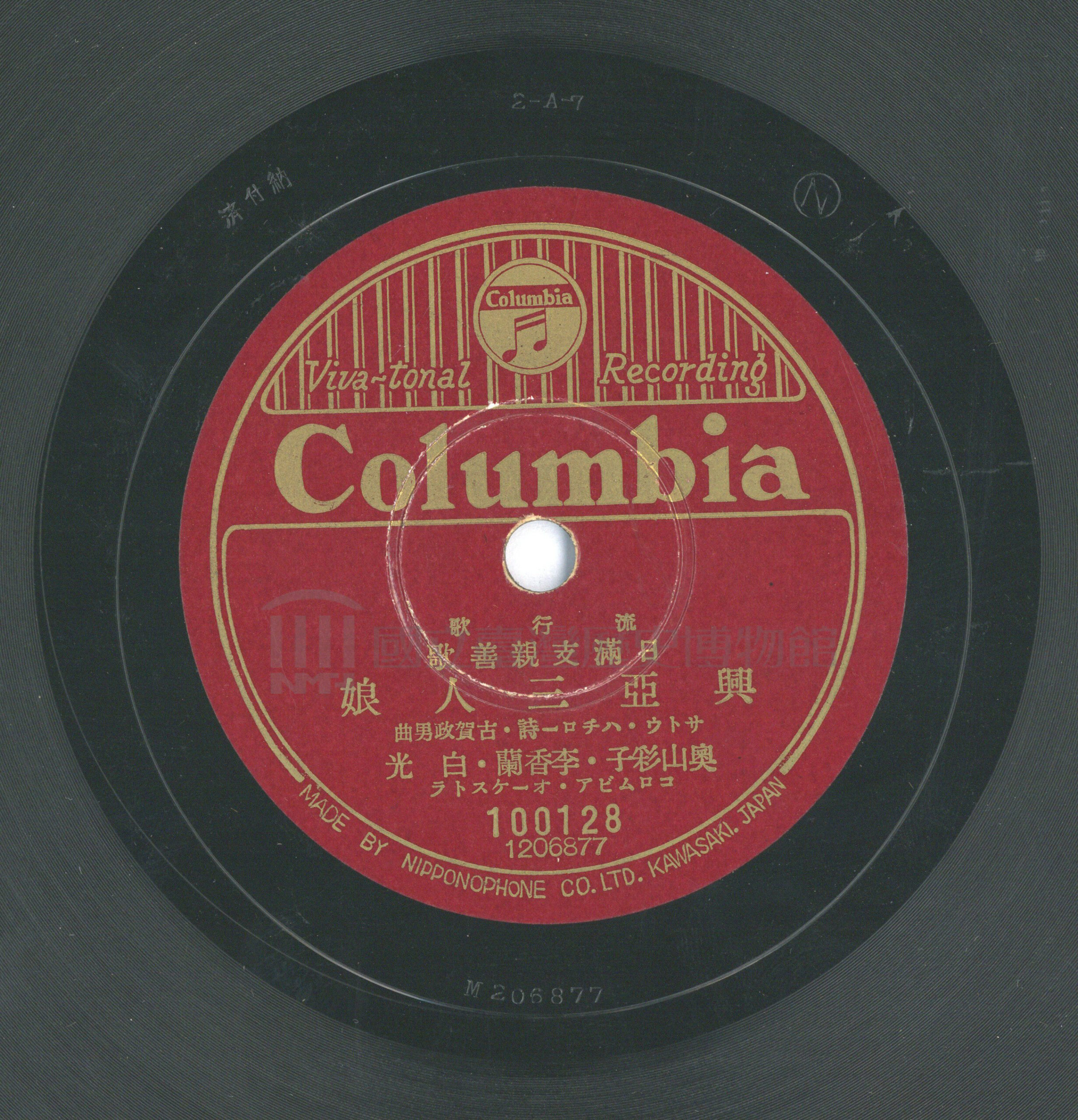 興亞三人娘 演出者奧山彩子、李香蘭、白光演唱創作者サトウ.ハチロー作詞、古賀政男作曲關鍵詞#唱歌 #流行歌 #戰爭時局內容註明為「日滿支親善歌」,三位演唱者先後各唱一段,分別代表了日本、滿州、漢族,最後再合唱。這張唱片為白光第一首灌錄的歌曲。聲音載體留聲機唱片發行編號日本コロムビア (古倫美亞)100128專輯年份《日滿支親善歌:興亞三人娘、心に咲く花》1940-12-01 00:00:00其他曲目曲目-心に咲く花來源專案臺史博館藏錄音 相關照片