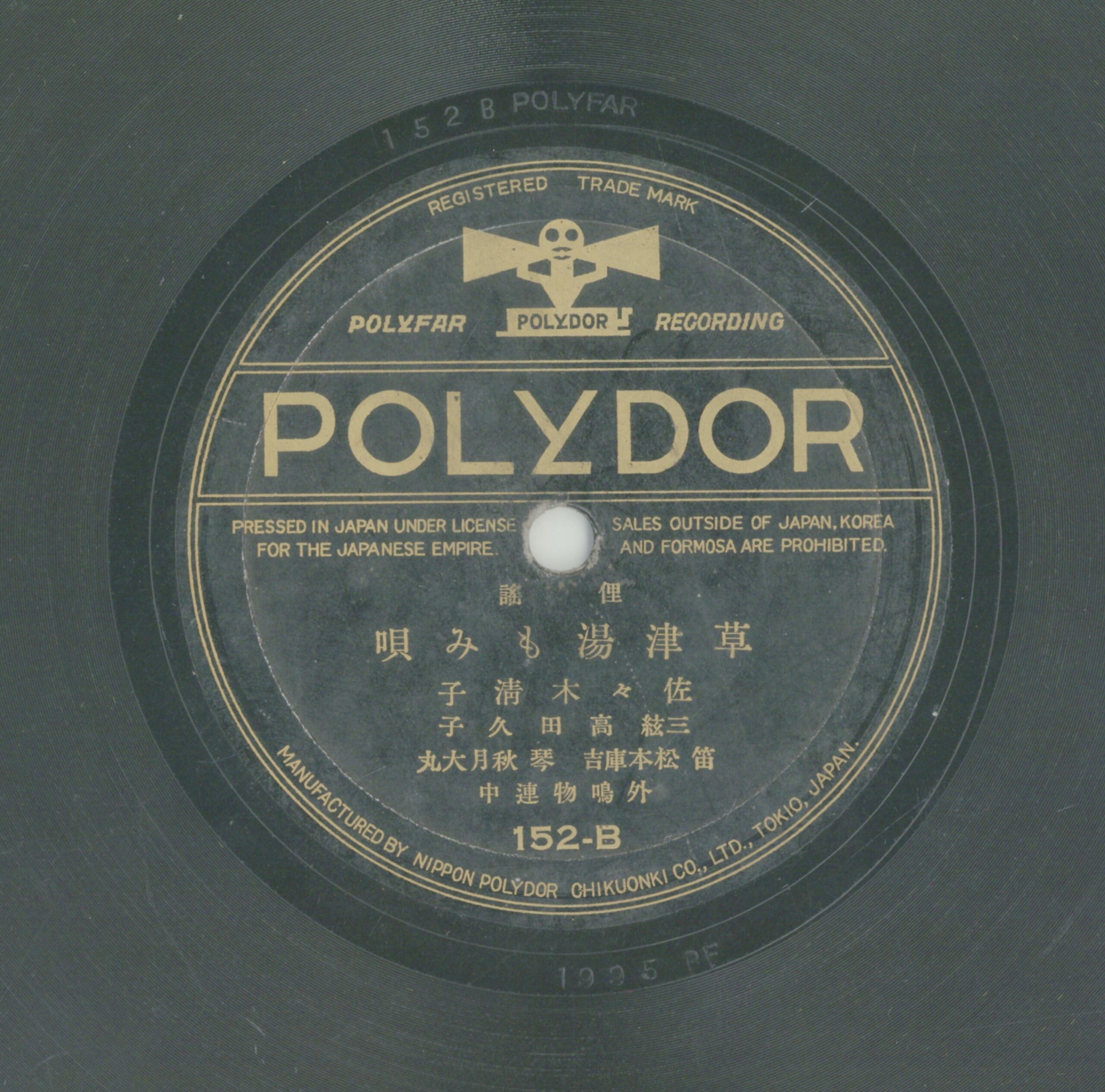 草津湯もみ唄 演出者佐佐木清子演唱關鍵詞#俚謠內容三弦:高田久子;尺八:松本庫吉;琴:秋月大丸;外:鳴物連中聲音載體留聲機唱片發行編號POLYDOR152專輯年份《俚謠:草津節/草津湯もみ唄》1930其他曲目A-草津節來源專案臺史博館藏錄音發布(2026) 相關照片