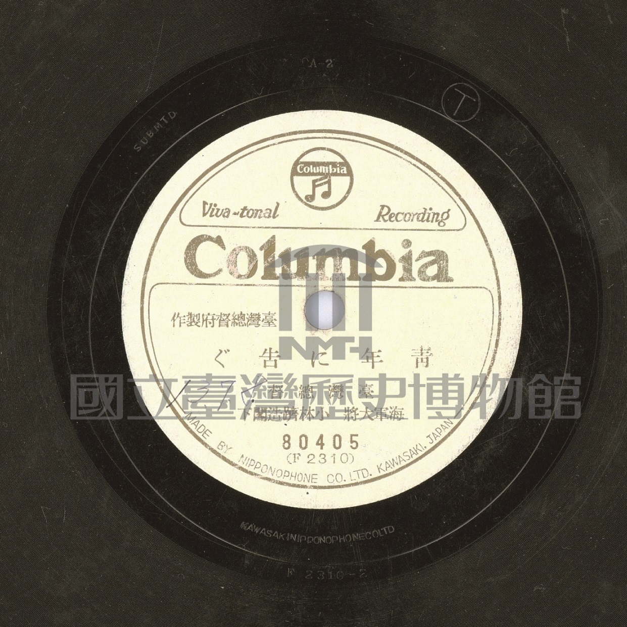 講演:青年に告ぐ 演出者臺灣總督 海軍大將 小林躋造閣下演唱關鍵詞#演講 #總督 #皇民化內容小林躋造為帶領臺灣總督府走入戰時體制的臺灣總督,推動以「皇民化、工業化、南進基地化」三原則統治台灣。聲音載體留聲機唱片發行編號日蓄 (古倫美亞)80405專輯年份《講演/歌曲:向青年演說》1938年05月專輯資訊為1938年臺灣總督府製作、臺灣古倫比亞販賣株式會社出版,臺灣總督小林躋造錄製留聲機唱片,呼籲青年在戰時體制下的精神動員。其他曲目B-臺灣青年歌來源專案日本民博音響資料係授權(2019) 歌詞/全文 小林躋造為帶領臺灣總督府走入戰時體制的臺灣總督,推動以「皇民化、工業化、南進基地化」三原則統治台灣。 相關照片