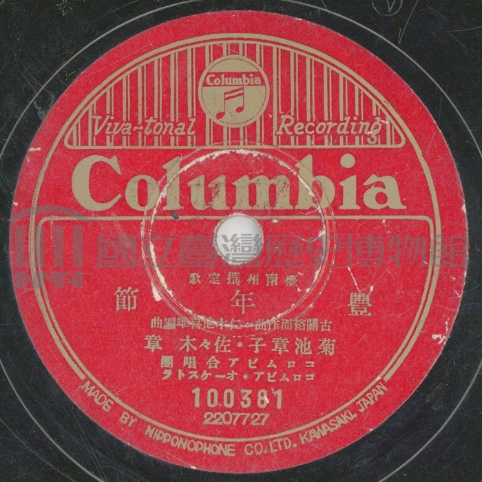 豐年節 演出者菊池章子、佐佐木章演唱關鍵詞#節慶歌謠 #創作民謠 #地方歌謠內容日本統治時期地方政府募集的日語歌謠,經官方及日本民間機構宣傳。聲音載體留聲機唱片發行編號日本コロムビア (古倫美亞)100381專輯年份《新民謠:嘉南節、豐年節》1941~1942其他曲目曲目-嘉南節來源專案臺史博館藏錄音 相關照片