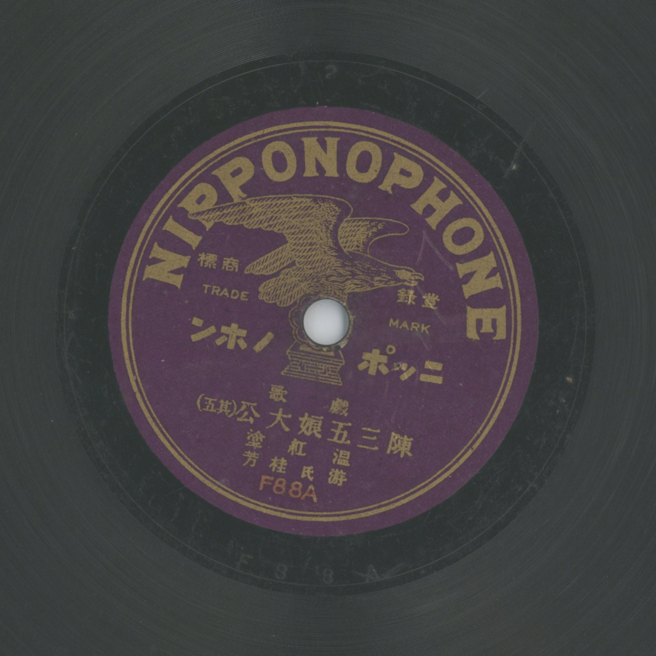 陳三五娘大公 (五) 演出者溫紅塗、游氏桂芳演唱關鍵詞#歌仔戲 #陳三五娘聲音載體留聲機唱片發行編號日蓄 (鷹標紫色)F88專輯年份《戲歌:陳三五娘大公》1926~29其他曲目3-陳三五娘大公 (三) 4-陳三五娘大公 (四) 6-陳三五娘大公 (六)來源專案臺史博館藏錄音發布(2026) 相關照片