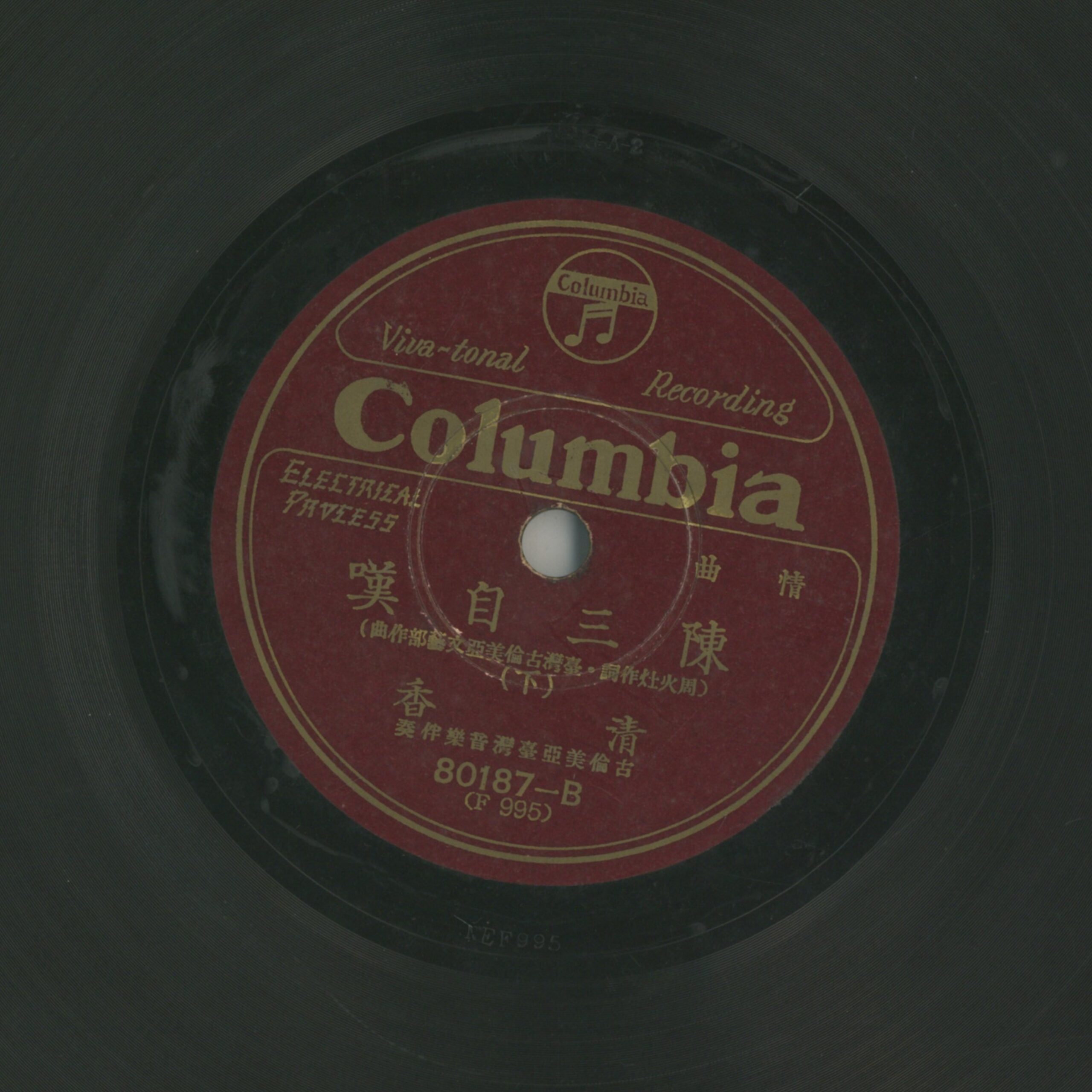 陳三自嘆 (下) 演出者清香演唱 古倫美亞臺灣音樂伴奏創作者周火灶作詞 臺灣古倫美亞文藝部作曲關鍵詞#歌仔戲 #流行歌 #陳三五娘聲音載體留聲機唱片發行編號日蓄 (古倫美亞-臺灣)80187專輯年份《情曲:陳三自嘆》1931~32其他曲目A-陳三自嘆 (上)來源專案臺史博館藏錄音發布(2026) 相關照片