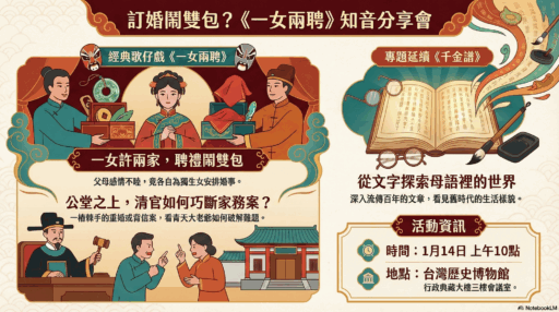 不論你是對歌仔戲故事感興趣,還是好奇《千金譜》那個時代的生活樣貌,都歡迎在1月14日10點,來到我們台灣歷史博物館行政典藏大樓的三樓會議室,參加這次的分享會。